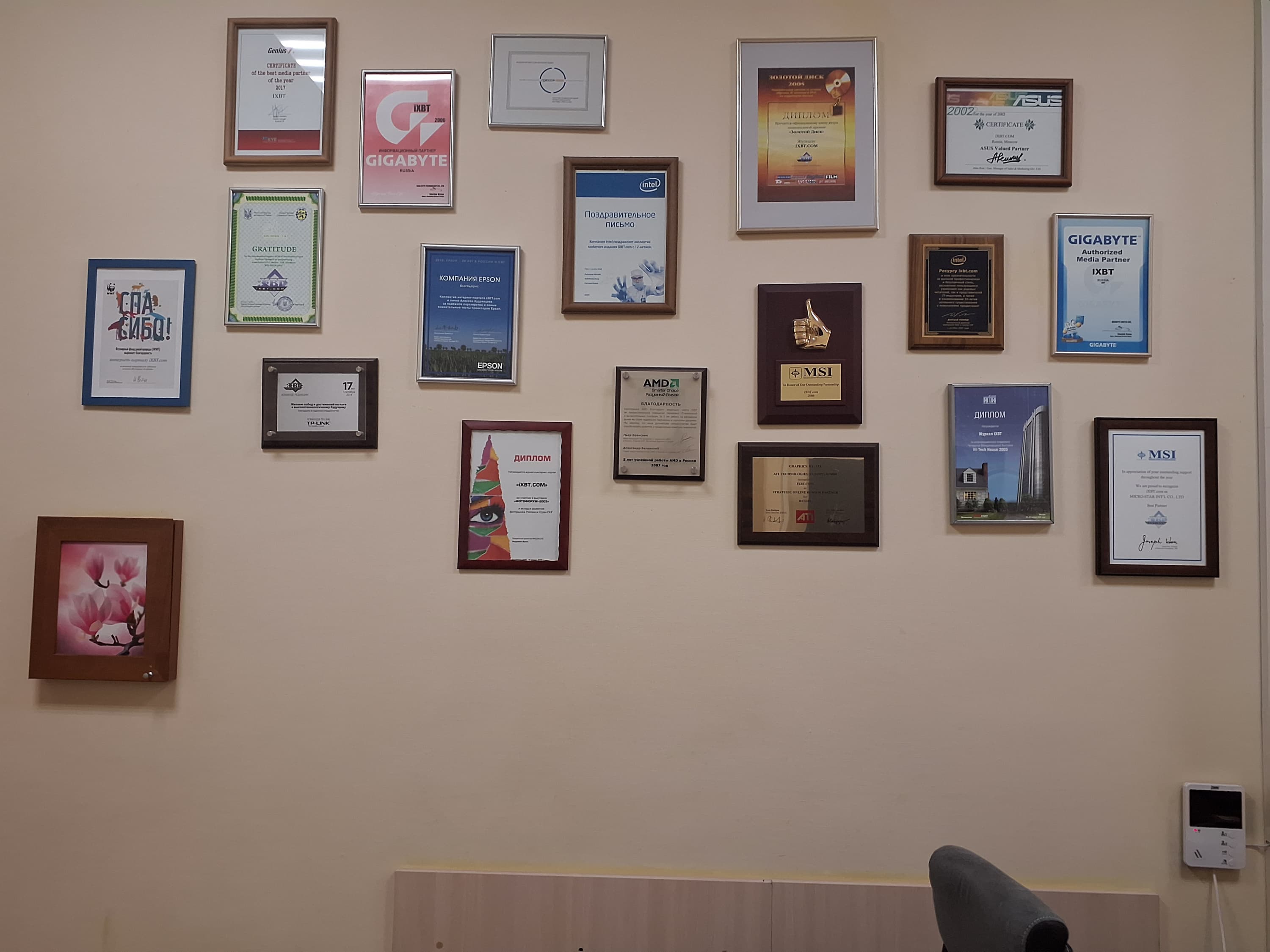 Для сравнения приведем фотографии, на которых на экран тестируемого планшета (он ниже) и на экран второго участника сравнения (Nexus 7, он выше) выведены одинаковые изображения, при этом яркость экранов изначально установлена примерно на 200 кд/м², а цветовой баланс на фотоаппарате принудительно переключен на 6500 К.