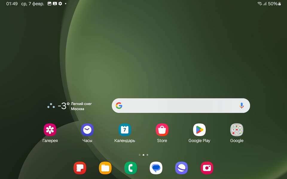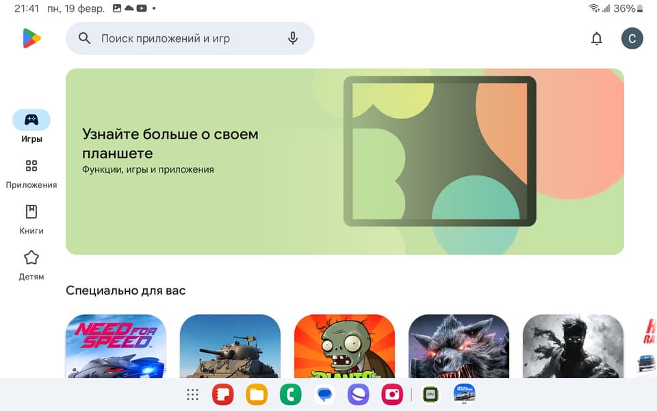 Перечислим некоторые особенности интерфейса планшета. Во-первых, здесь на домашнем экране есть панель с наиболее важными приложениями (вы можете менять их расположение и сам набор). Во-вторых, если вы запускаете какое-то приложение, то панель всё равно остается на экране, только немного уменьшается, а к иконкам важных приложений добавляются еще и часто используемые. Вот, например, мы запустили Google Play Store, но внизу всё равно есть этот блок.
