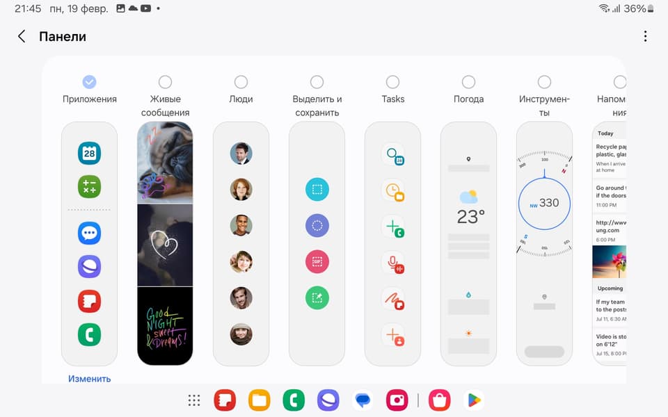 Далее, от правого края экрана (при ландшафтной ориентации планшета) вытягивается еще одна панель, где по умолчанию расположены иконки различных приложений, которые вы можете заменить на другие или вывести туда какие-то виджеты. Этих панелей может быть несколько, между ними можно переключаться свайпами.