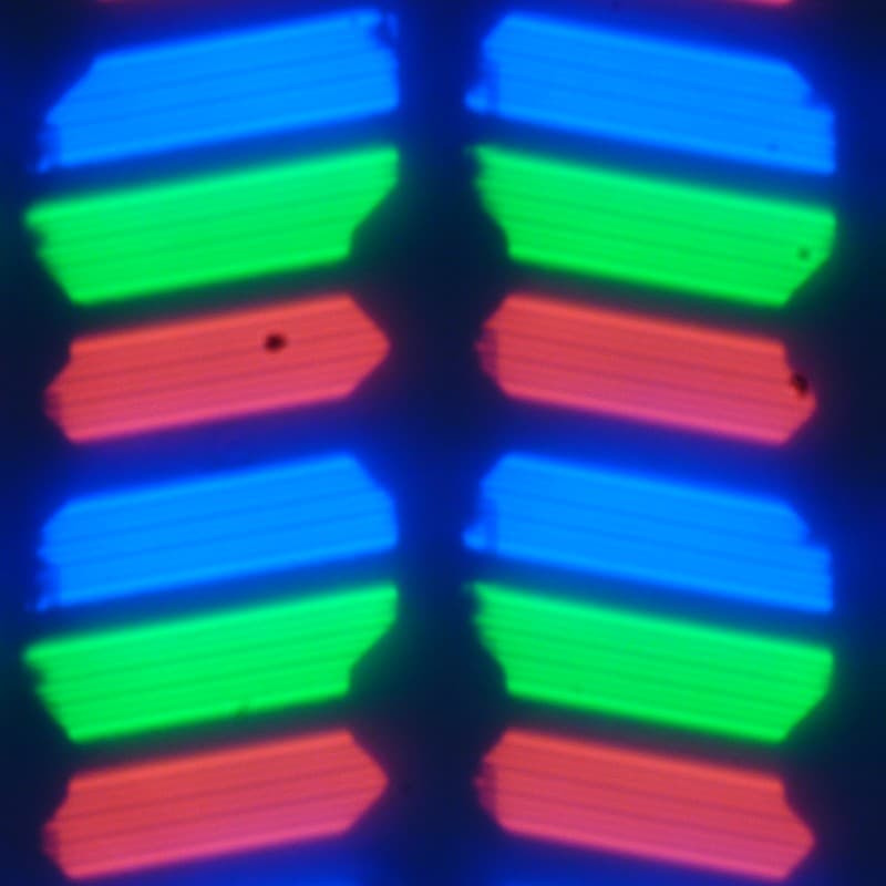 В данном планшете используется матрица типа IPS. Микрофотографии демонстрируют типичную для IPS структуру субпикселей: