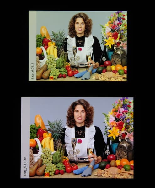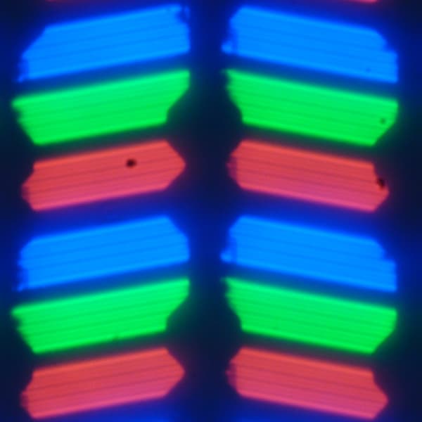 Спектры компонент хорошо разделены, что и обуславливает широкий цветовой охват. Для потребительского устройства широкий цветовой охват является недостатком, поскольку в итоге цвета изображений — рисунков, фотографий и фильмов, — ориентированных на пространство sRGB (а таких подавляющее большинство), имеют неестественную насыщенность. Особенно это заметно на узнаваемых оттенках, например на оттенках кожи. Результат приведен на фотографиях выше.