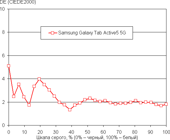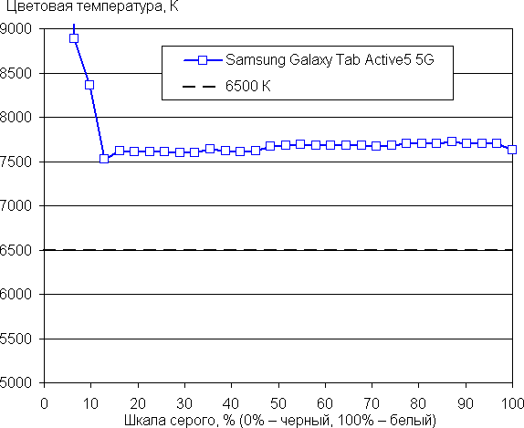 Баланс оттенков на шкале серого средний, так как цветовая температура существенно выше стандартных 6500 К, но отклонение от спектра абсолютно черного тела (ΔE) остается ниже 10, что для потребительского устройства считается приемлемым показателем. При этом цветовая температура и ΔE мало изменяются от оттенка к оттенку — это положительно сказывается на визуальной оценке цветового баланса. (Самые темные области шкалы серого можно не учитывать, так как там баланс цветов не имеет большого значения, да и погрешность измерений цветовых характеристик на низкой яркости большая.)