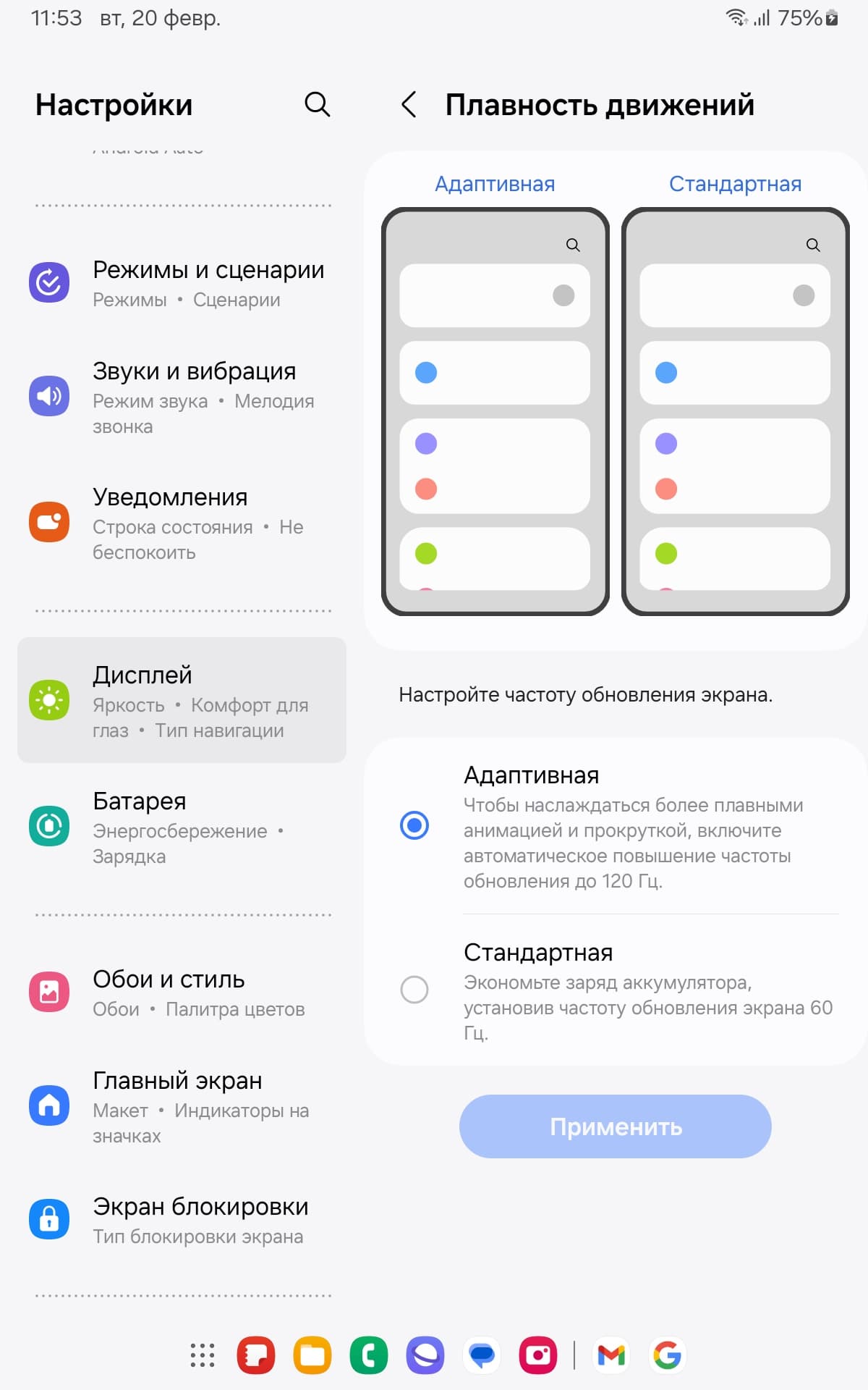 В настройках экрана можно включить режим с повышенной до 120 Гц частотой обновления: