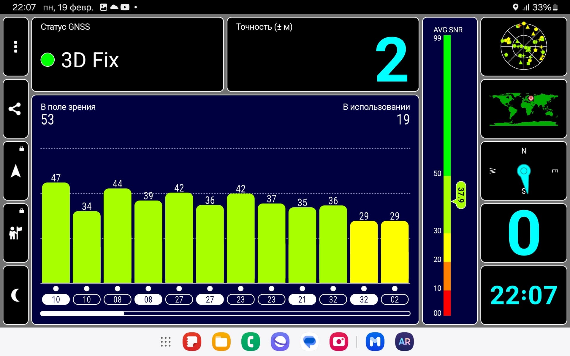 При холодном старте первые спутники GPS планшет находит уже через 15 секунд, а примерно через полторы минуты оказываются видны спутники Глонасс и более 50 спутников GPS (на открытой местности).