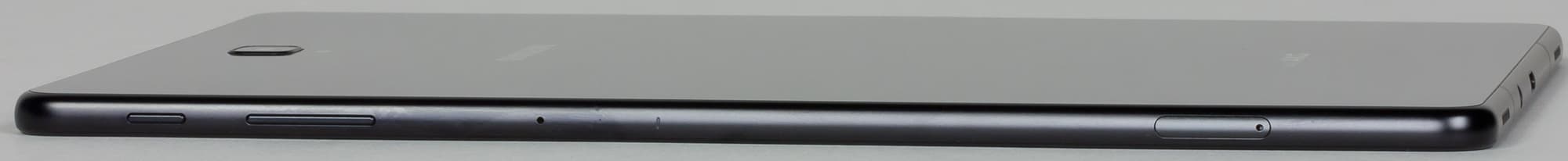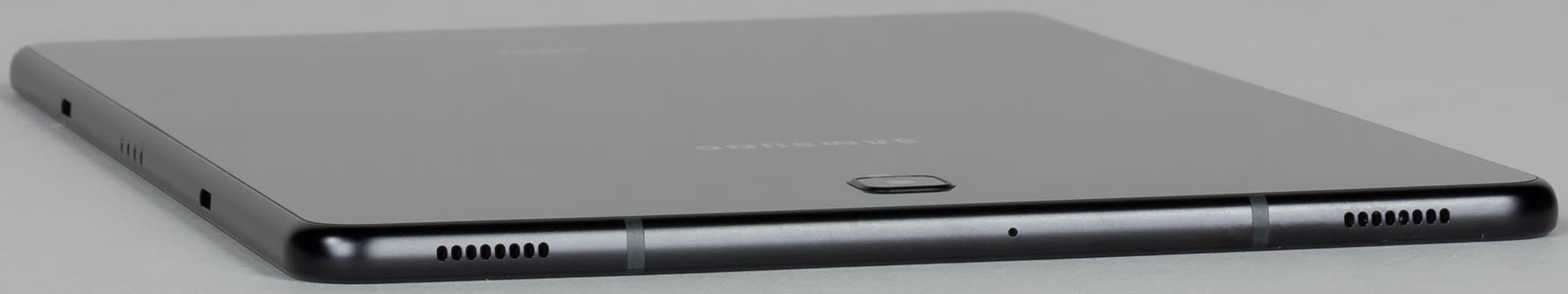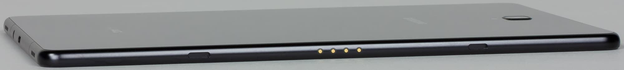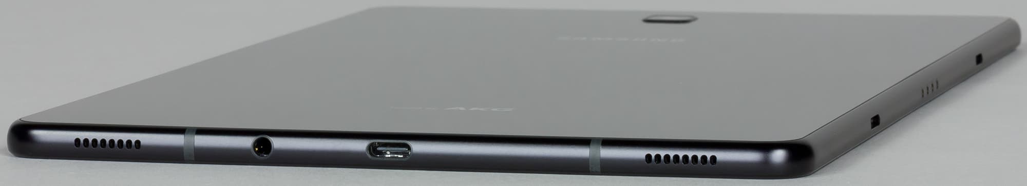 Один из важнейших элементов дизайна — встроенные динамики AKG, решетки которых мы видим в четырех местах: на коротких гранях сверху и снизу. Таким образом, как и iPad Pro, новинка обеспечивает равномерный стереозвук. Причем по качеству он очень даже неплох для данного форм-фактора — особенно на средних частотах. Однако у iPad Pro звук все же более басовитый, у Galaxy Tab S4 нижние частоты все-таки «плосковаты».