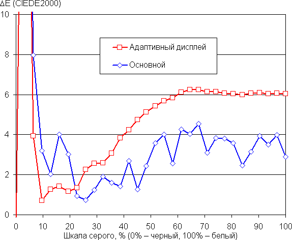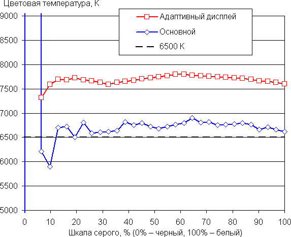 Баланс оттенков на шкале серого приемлемый в случае профиля Адаптивный дисплей и хороший в профиле Основной. Цветовая температура близка к 6500 К, при этом на значимом участке шкалы серого этот параметр изменяется не очень сильно, что улучшает визуальное восприятие баланса цветов. Отклонение от спектра абсолютно черного тела (ΔE) на большей части шкалы серого остается ниже 10 единиц, что для потребительского устройства считается хорошим показателем: