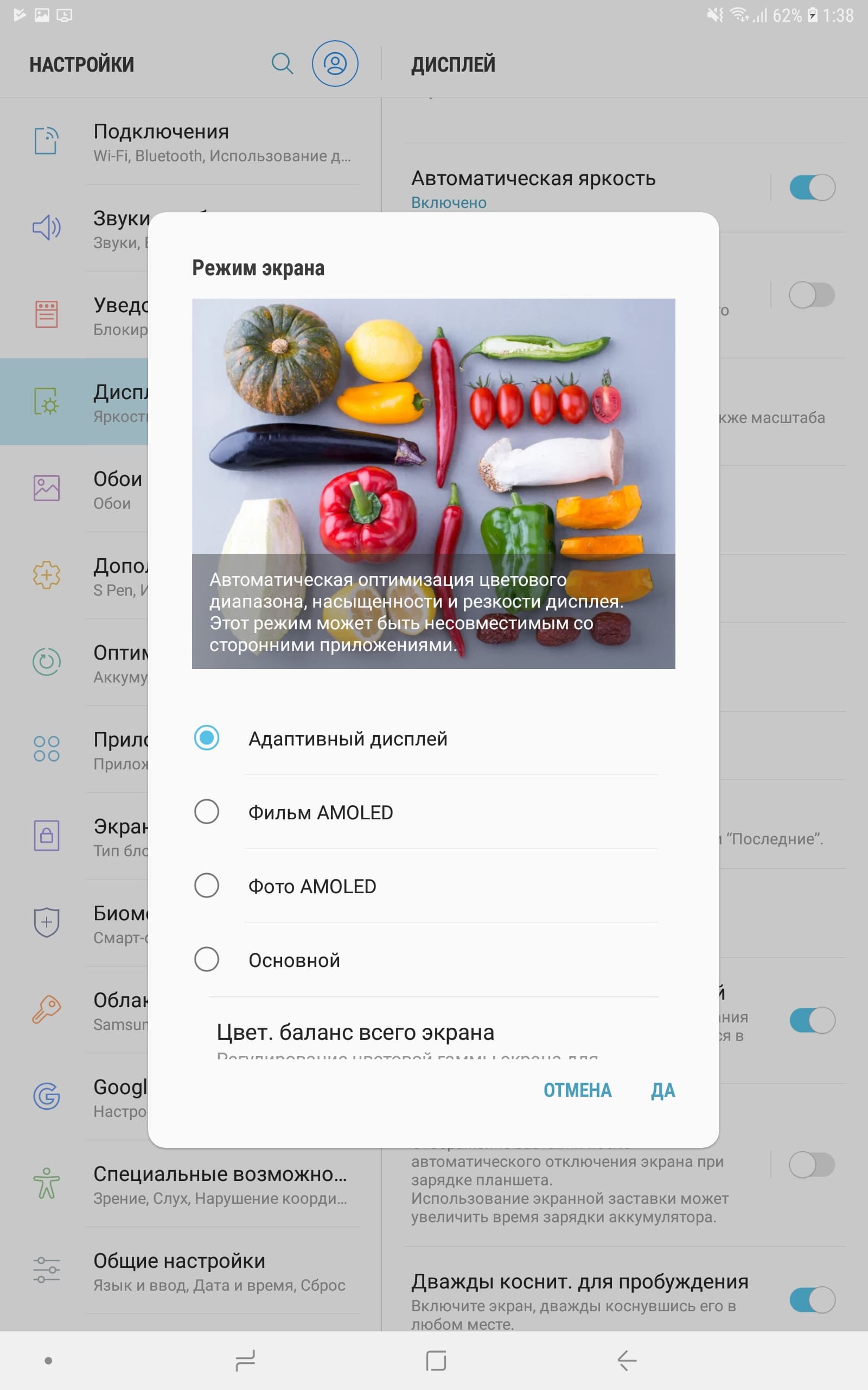 Фотография выше получена после выбора профиля Основной в настройках экрана, всего их четыре: