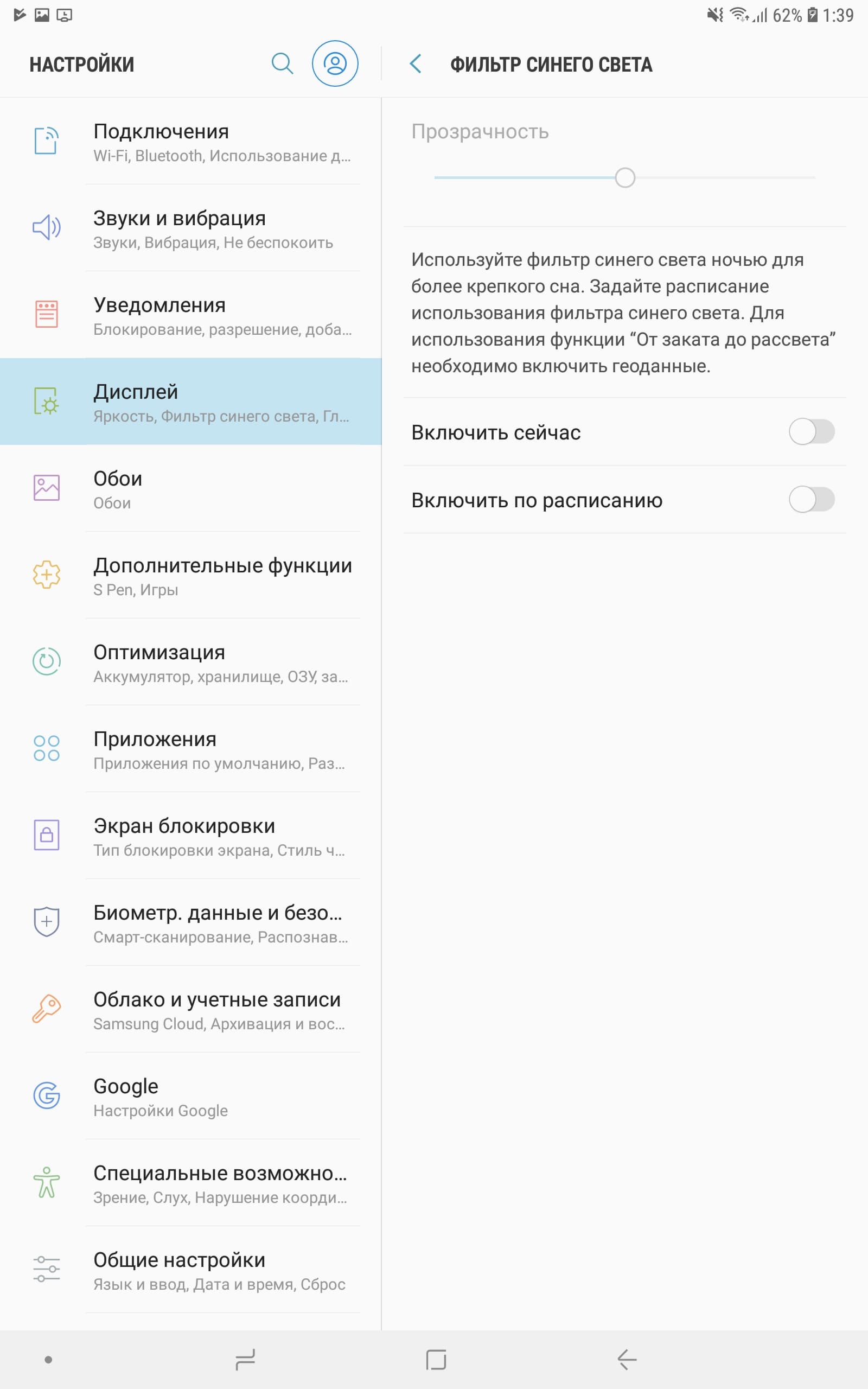 Почему-то только при выборе профиля Адаптивный дисплей появляется возможность настройки цветового баланса ползунком цветовой температуры и тремя регулировками интенсивности основных цветов, но из-за слишком широкого цветового охвата как раз в этом профиле нет смысла исправлять именно баланс. Есть модная нынче функция Фильтр синего света, для которой в настройках даже приведено белее-менее корректное описание (в меню уровня выше написана ерунда про «снижение глазного напряжения», ну да ладно):