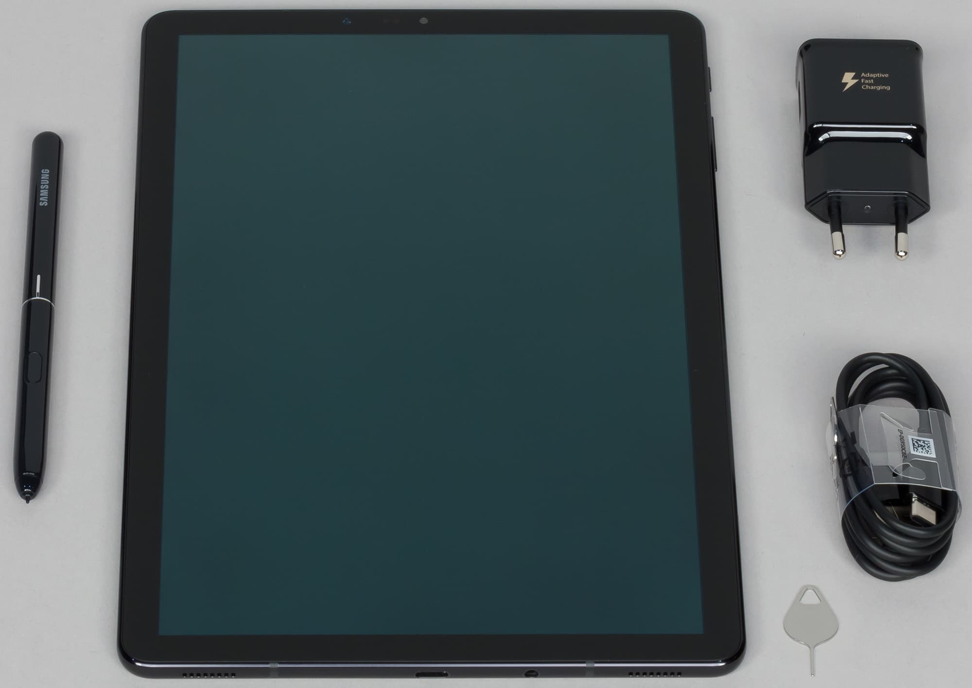 Поскольку у нас на тестировании был предпродажный образец, мы не можем оценить его упаковку, да и комплектация нам доступна лишь частично. Так, к сэмплу были приложены зарядное устройство 5 В 2 А (9 В в режиме быстрой зарядки), кабель USB-C, электронное перо и ключик для извлечения лотка под карточки.