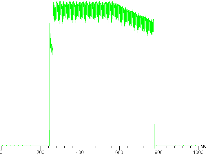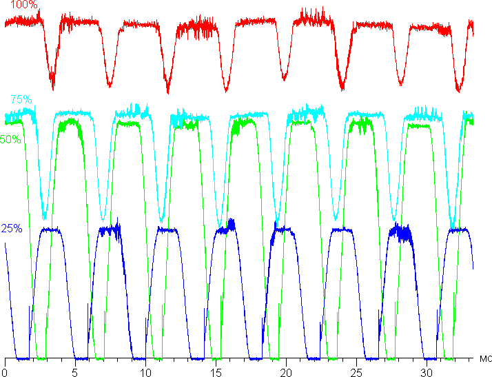 Видно, что на максимальной и близкой к ней яркости амплитуда модуляции не очень большая, в итоге видимого мерцания нет. Однако при понижении яркости появляется модуляция с большой относительной амплитудой, ее наличие уже можно увидеть в тесте на присутствие стробоскопического эффекта или просто при быстром движении глаз. В зависимости от индивидуальной чувствительности такое мерцание может вызывать повышенную утомляемость.