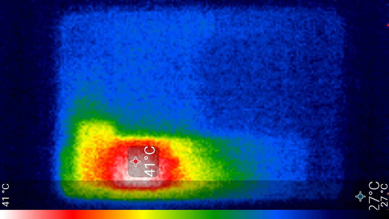 Нагрев сильно локализован выше центра и близко к правому краю, что, видимо, соответствует расположению микросхемы SoC. По данным теплокамеры, максимальный нагрев составил 41 градус (при температуре окружающего воздуха в 24 градуса), это средний результат в данном тесте для современных мобильных устройств.