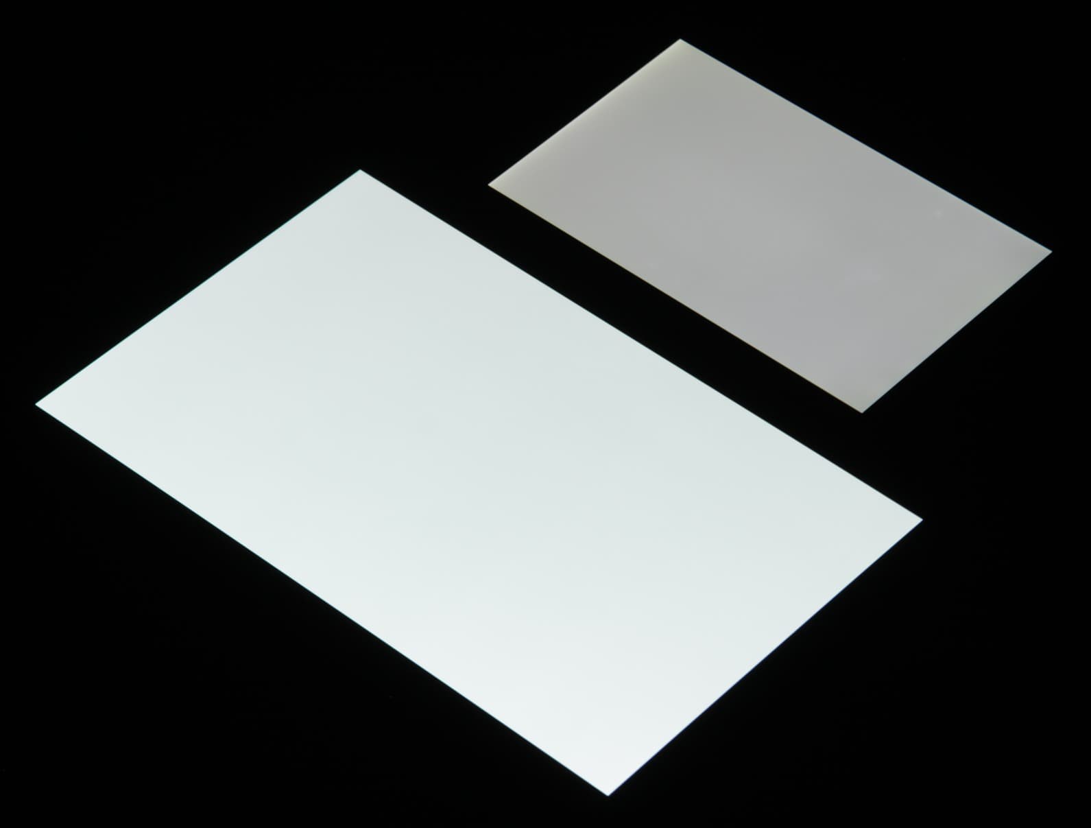 Лицевая поверхность экрана выполнена в виде стеклянной пластины с зеркально-гладкой поверхностью, устойчивой к появлению царапин. Судя по отражению объектов, антибликовые свойства экрана хуже, чем у экрана Google Nexus 7 (2013) (далее просто Nexus 7). Для наглядности приведем фотографию, на которой в выключенных экранах отражается белая поверхность (слева — Nexus 7, справа — Samsung Galaxy Tab S4, далее их можно различать по размеру):