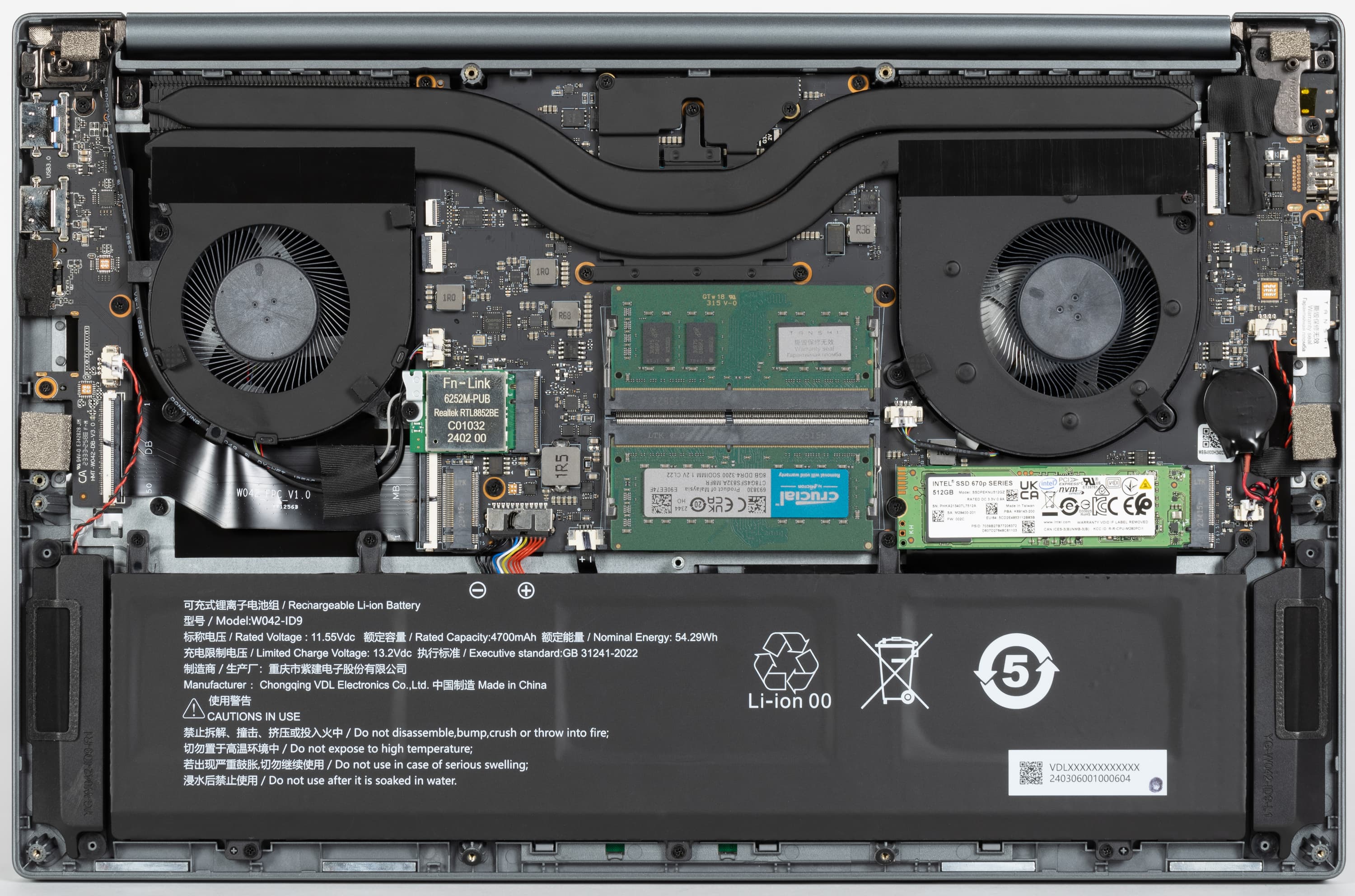 С завода ноутбук приезжает с двумя 8-гигабайтными модулями DDR4-3200 Crucial/Micron CT8G4SFS832A. По нынешним меркам ОЗУ не слишком расторопное. Можно изменить наполнение слотов памяти, доведя ее максимальный объем до 64 ГБ.