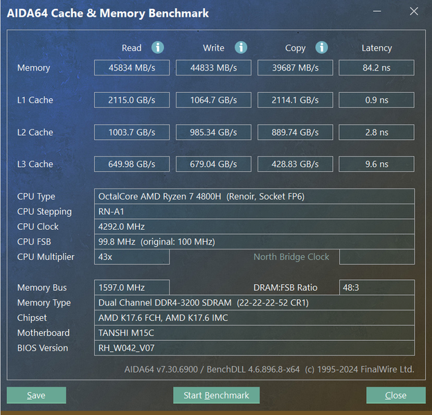 Tanshi M15C оснащен мобильным процессором AMD Ryzen 7 4800H поколения Renoir-H (ядра Zen 2). Это довольно старое решение (анонс в январе 2020 г.) и явно не топовое. В составе чипа 8 двухпотоковых ядер (всего 16 потоков), тактовая частота составляет 2,9 в стабильном режиме и 4,2 ГГц при разгоне. Теплопакет 45 Вт, Tmax 105 °C. В тестах под нагрузкой мы видели, что процессор отбирал при разгоне 38 Вт мощности, что несколько ниже предписаний термопакета, а в стабильном режиме потребление составило 35 Вт. Тактовая частота не превышала 2,5 ГГц.