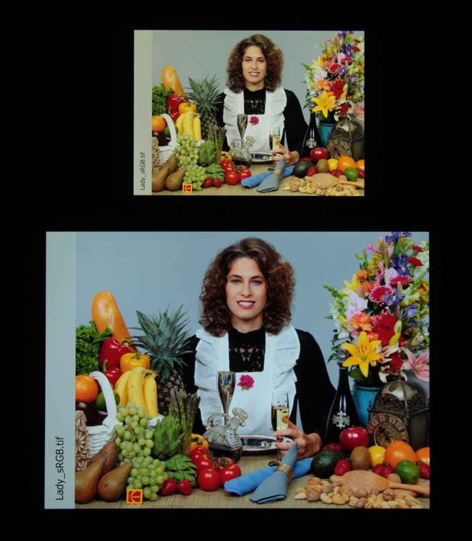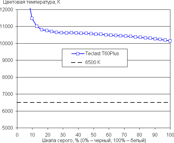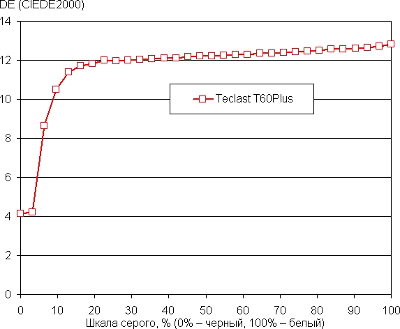 По умолчанию отклонение от спектра абсолютно черного тела (ΔE) на шакале серого высокое, но хотя бы при этом цветовая температура и ΔE мало изменяются от оттенка к оттенку серого — это положительно сказывается на визуальной оценке цветового баланса. (Самые темные области шкалы серого можно не учитывать, так как там баланс цветов не имеет большого значения, да и погрешность измерений цветовых характеристик на низкой яркости большая.)