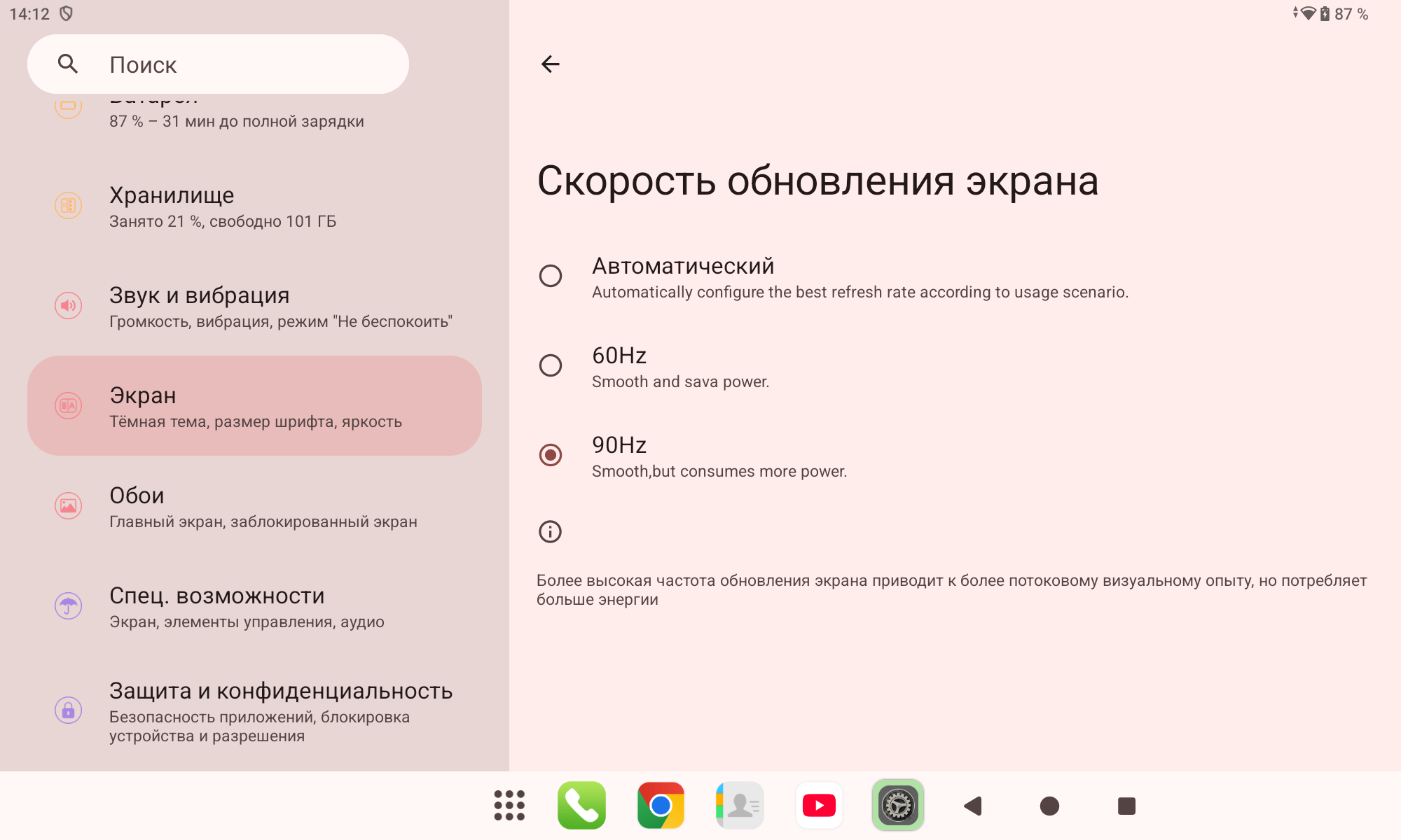 В настройках экрана можно включить режим с повышенной до 90 Гц частотой обновления. В режиме 90 Гц плавность прокрутки списков меню заметно повышается.
