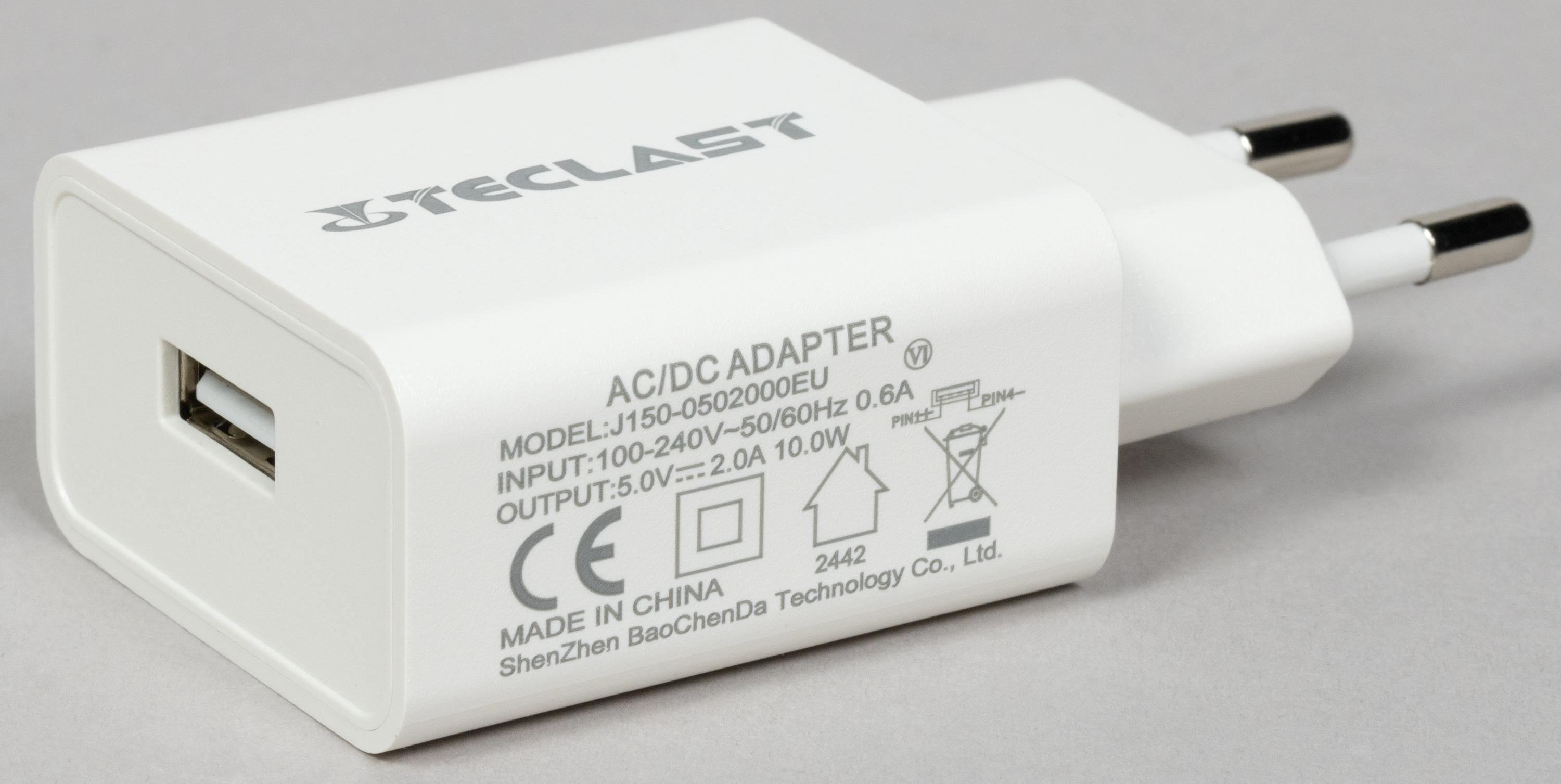 Зарядное устройство имеет максимальную мощность 10 Вт (5 В 2 А). Увы, в отличие от более крупной модели Teclast, здесь не предусмотрено быстрой зарядки, что, конечно, минус, учитывая весьма большую емкость аккумулятора.