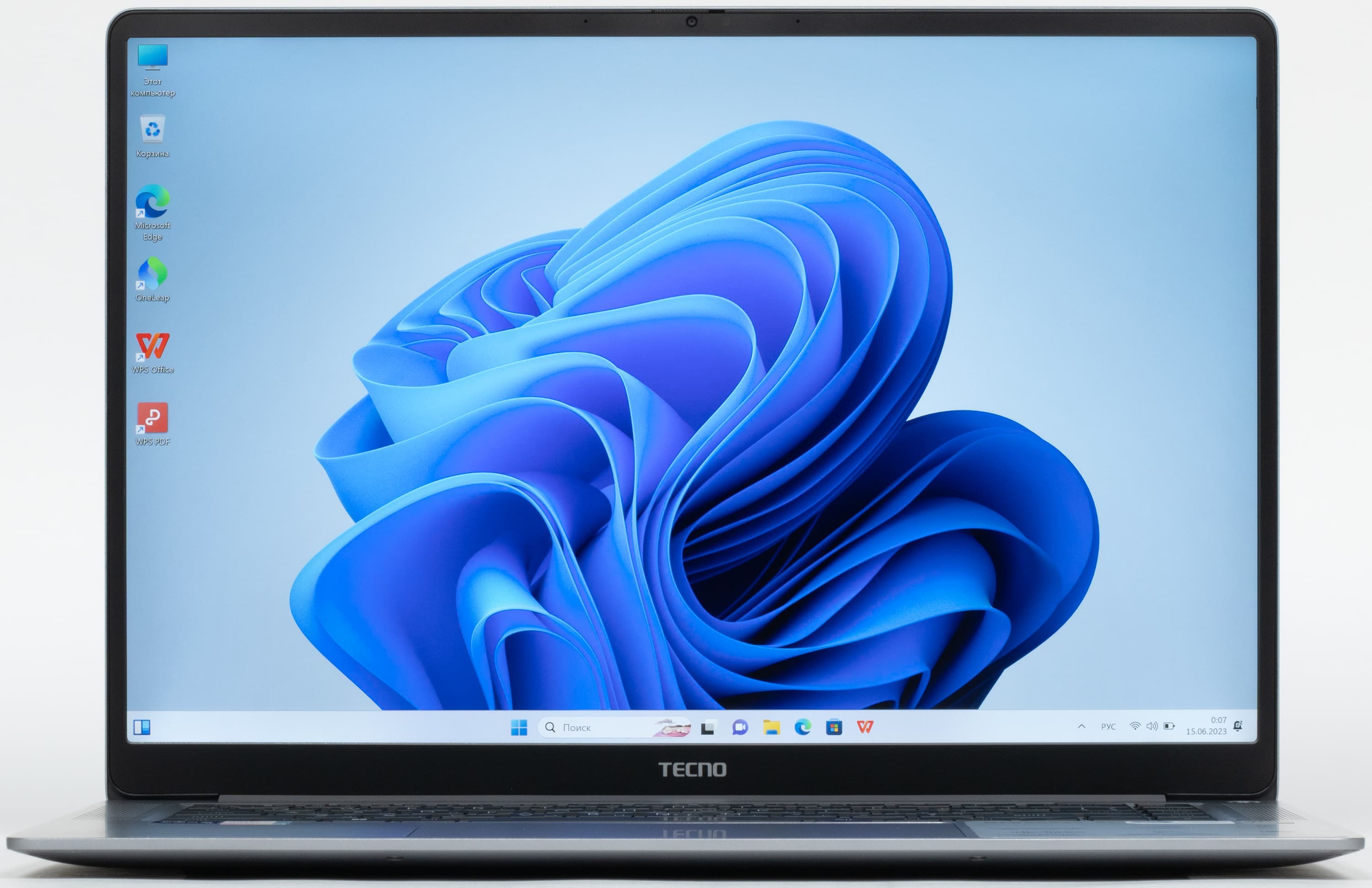 В аппаратной оснастке более всего впечатляют не процессор (предыдущего поколения, маломощный, но энергоэкономичный), не объем оперативной памяти и емкость системного накопителя, а экран со сверхвысоким разрешением. Производителем заявлена его яркость на максимуме 450 нит (по нашим измерениям — 388 кд/м², но это тоже очень хорошо). Акустика представлена тремя парами динамиков. Порты HDMI плюс USB Type-C с поддержкой DisplayPort дают возможность подключить к машине три внешних монитора одновременно. Для деловых людей несомненную полезность представляют веб-камера 2 Мп, микрофоны с шумоподавлением, трехполосная акустическая система (6 динамиков), картовод для microSD и дактилоскопический сканер в кнопке включения питания, позволяющий идентифицировать пользователя при «холодном» старте без необходимости дополнительного ввода пароля. В отличие от некоторых конкурентов, продаваемых сегодня в России, Tecno Megabook S1 поставляется с предустановленной Windows 11 Home, поэтому ноутбук можно немедленно испытать на пригодность в магазине или при интернет-доставке.
