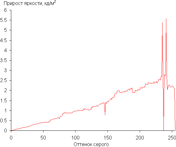 Время отклика при переходе черный-белый-черный равно 26 мс (15 мс вкл. + 11 мс выкл.), переход между полутонами серого в сумме (от оттенка к оттенку и обратно) в среднем занимает 27 мс. Матрица небыстрая, но у нее есть небольшой разгон — на фронтах некоторых переходов есть характерные выбросы яркости. Например, так выглядит график для переходов между оттенками 70% и 90%: