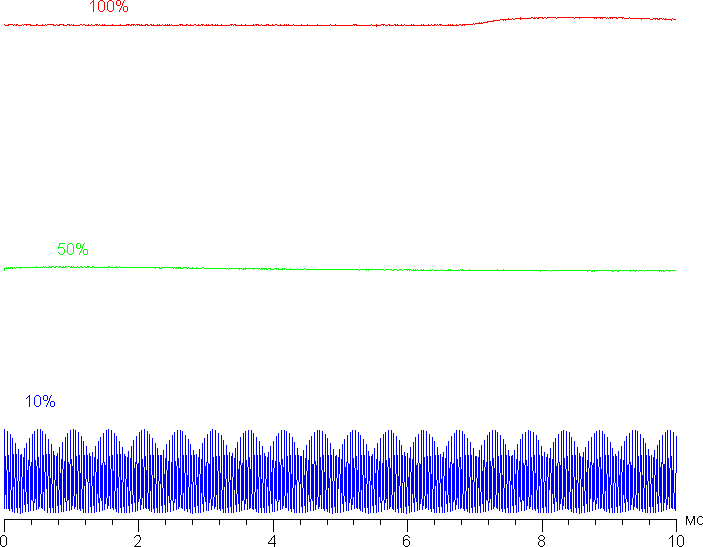 При сильном снижении яркости от максимальной появляется модуляция подсветки, но ее частота очень высокая (25 кГц), поэтому никакого видимого глазом мерцания экрана нет, не выявляется оно и в тесте на стробоскопический эффект. Приведем графики зависимости яркости (вертикальная ось) от времени (горизонтальная ось) при различных значениях настройки яркости: