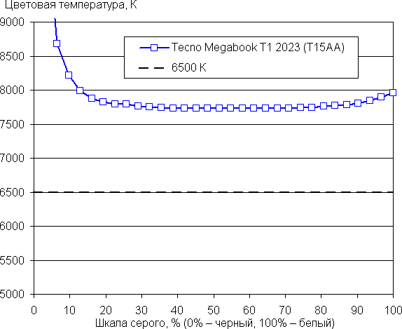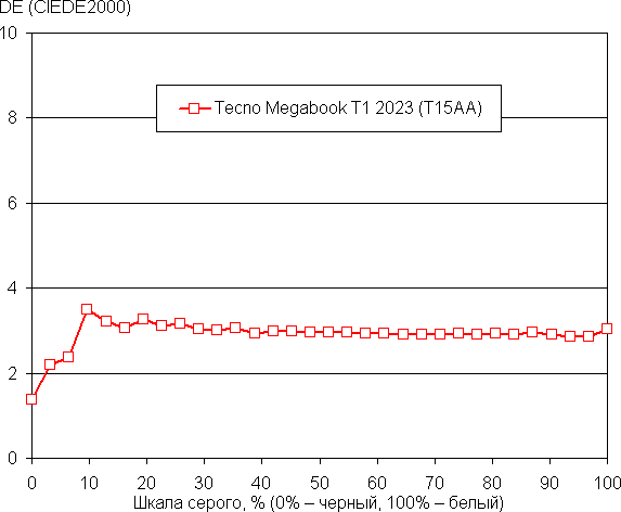 Баланс оттенков на шкале серого приемлемый, так как цветовая температура не сильно выше стандартных 6500 К, а отклонение от спектра абсолютно черного тела (ΔE) ниже 10, что для потребительского устройства считается хорошим показателем. При этом цветовая температура и ΔE мало изменяются от оттенка к оттенку — это положительно сказывается на визуальной оценке цветового баланса. (Самые темные области шкалы серого можно не учитывать, так как там баланс цветов не имеет большого значения, да и погрешность измерений цветовых характеристик на низкой яркости большая.)