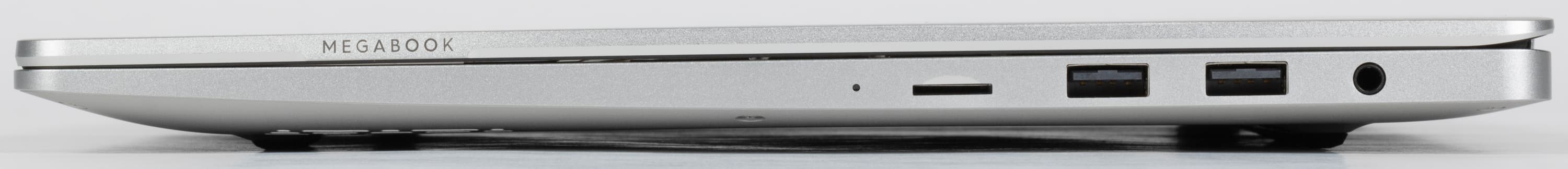 Набор интерфейсных портов обычный для моделей Tecno Megabook: довольно богатый по меркам подобных ноутбуков, но не самый современный по номенклатуре (к сожалению, то же относится и к беспроводными интерфейсам Wi-Fi/Bluetooth, и с этим тоже придется смириться, поскольку заменить соответствующий модуль нельзя). Отсутствие разъема и адаптера для проводной сети вполне простительно для компактной модели, зато многим владельцам будет полезен картовод microSD, который встречается не всегда.