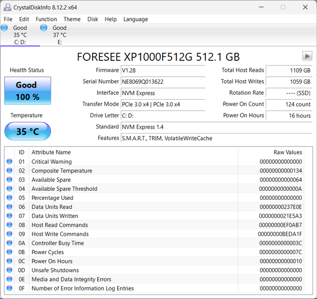 Установлен накопитель Foresee XP1000F512G (512 ГБ, M.2 2280, NVMe, PCIe 3.0 x4):