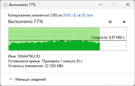 Второй тест — скорость реальных файловых операций, выполняемых средствами ОС: копирование 100 файлов изображений общим объемом 2,5 ГБ сначала с носителя в папку на рабочем столе, затем из папки на носитель.