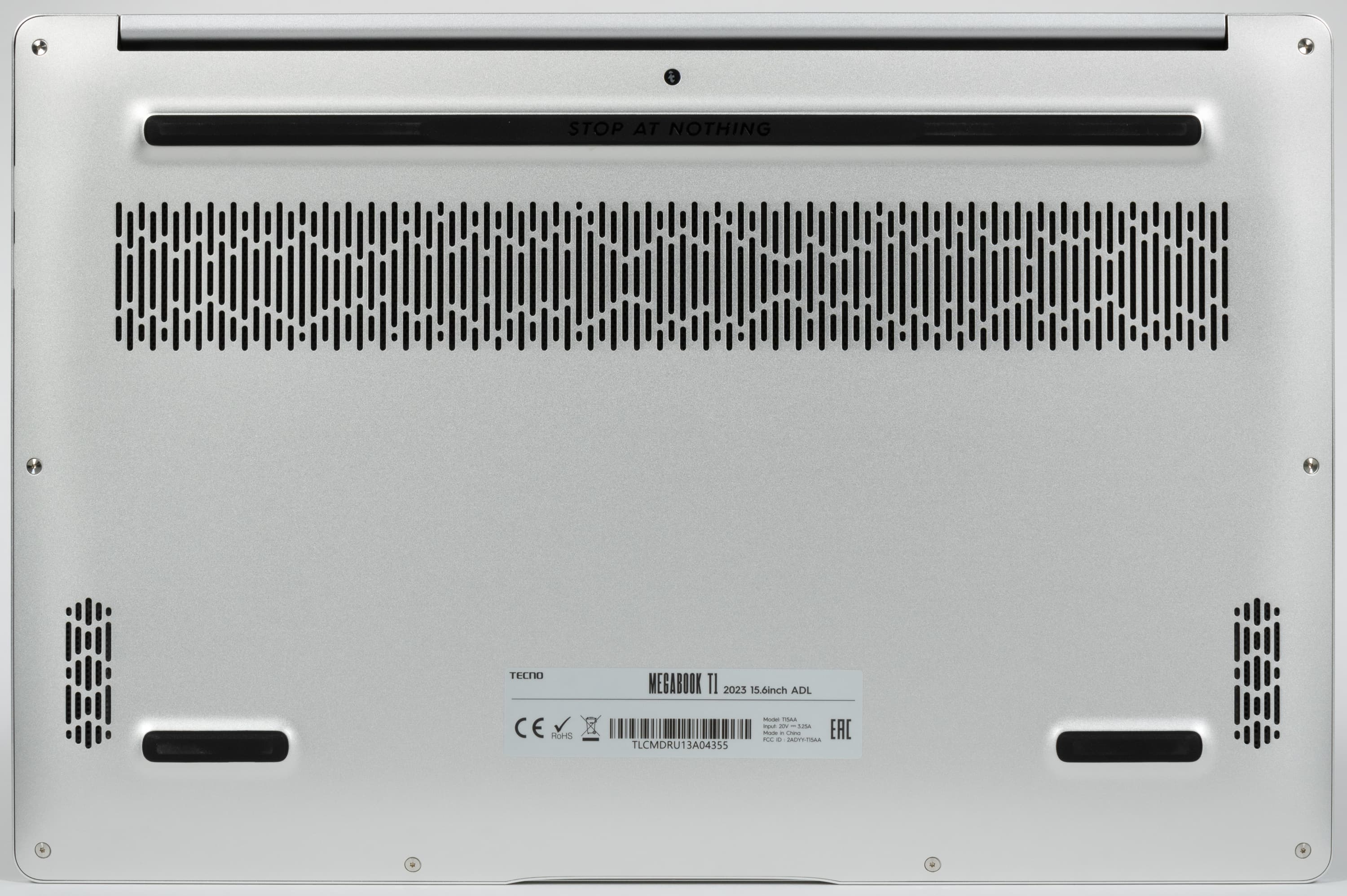 На днище, кроме ножек (спереди две небольшие, сзади одна почти по всей ширине), ближе к задней кромке имеется вентиляционная решетка, через которую происходит забор воздуха для охлаждения компонентов, поэтому ставить ноутбук на мягкую поверхность не следует.