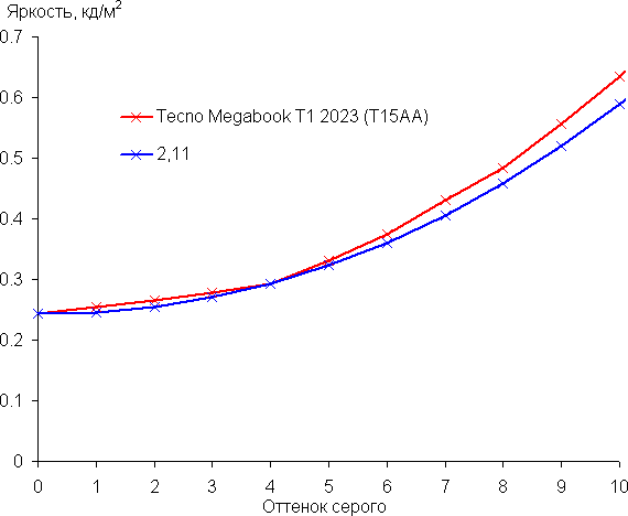 Рост прироста яркости на шкале серого более-менее равномерный, и каждый следующий оттенок ярче предыдущего. В самой темной области аппаратно и визуально различаются все оттенки: