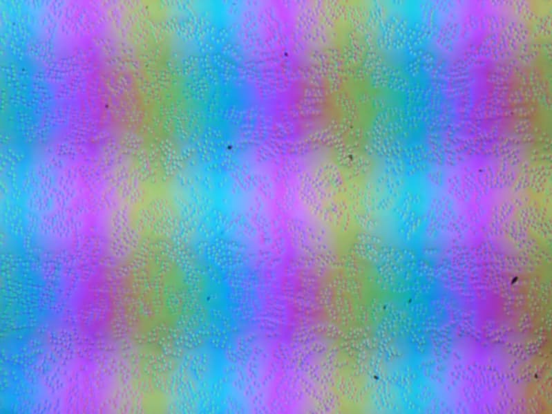 Зерно этих дефектов в несколько раз меньше размеров субпикселей (масштаб этих двух фотографий примерно одинаковый), поэтому фокусировка на микродефектах и «перескок» фокуса по субпикселям при изменении угла зрения выражены слабо, из-за этого нет и «кристаллического» эффекта.