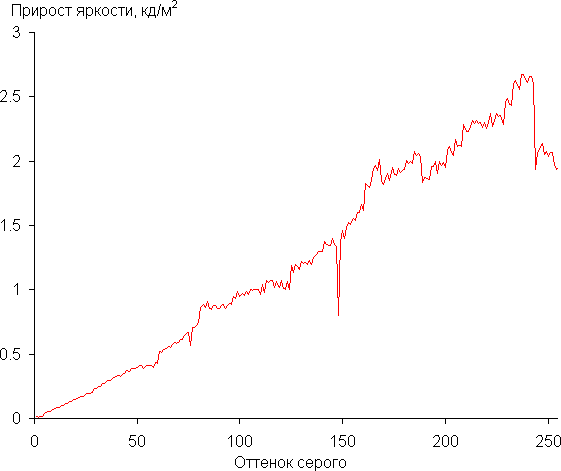 Далее мы измерили яркость 256 оттенков серого (от 0, 0, 0 до 255, 255, 255). График ниже показывает прирост (не абсолютное значение!) яркости между соседними полутонами: