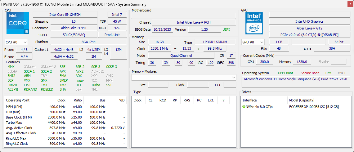 Второй тоже упоминался выше: Tecno Megabook S1 с Intel Core i7-1260P (4+8 ядер/16 потоков, до 3,7/5,0 ГГц, 20-64 Вт ), ОЗУ 16 ГБ LPDDR5, SSD Foresee FSb0C001T-C6C7200 PCIe 4.0 x4.