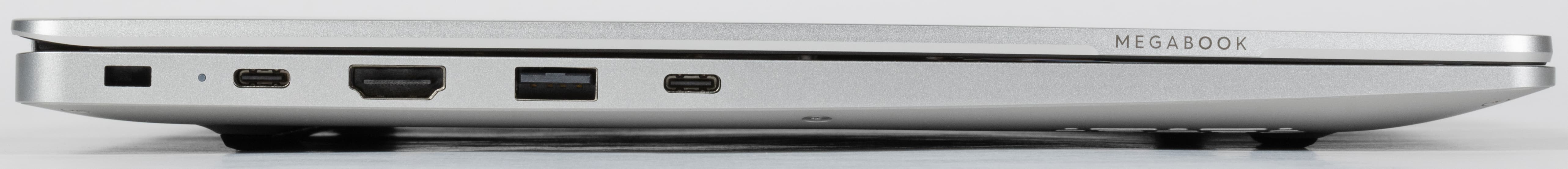 На левом боку имеются отверстие кенсингтонского замка, двухцветный светодиодный индикатор (белый+оранжевый), разъем USB Type-C для подключения адаптера питания (и только для этого — передача данных не поддерживается!), полноразмерный порт HDMI, порты USB 3.1 Type-A и еще один USB Type-C, на этот раз полнофункциональный.