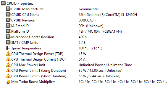 В ноутбуке установлен процессор 12-го поколения Intel Core i5-12450H (4+4 ядра/12 потоков, до 3,3/4,4 ГГц, TDP 35-45 Вт / Boost до 95 Вт, кодовое наименование Alder Lake, выпускается с начала 2022 года). У него 8 ядер, из них четыре Performance cores (P-cores, производительные), которые могут работать в два потока на частотах до 4,4 ГГц, и столько же однопоточных энергоэффективных Efficient cores (E-cores, до 3,3 ГГц), максимальное количество потоков будет двенадцать. В нашем случае в предшествующих тестах длительное потребление достигало лишь 30 Вт, а пиковые значения не превышали 42 Вт, то есть процессор заметно «придушен».