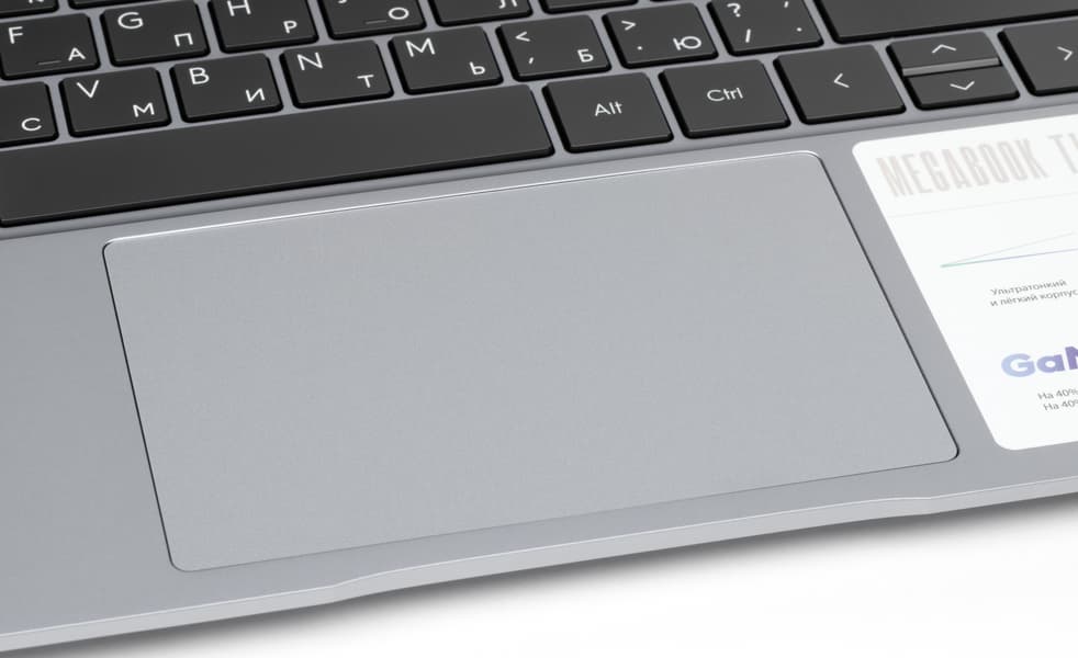 Клавиатура точно такая, как в уже знакомой нам модели Tecno Megabook T15AA — мембранного типа с островным расположением кнопок и трехрядным цифровым блоком. Клавиши со стрелками вверх и вниз имеют «половинную» высоту.