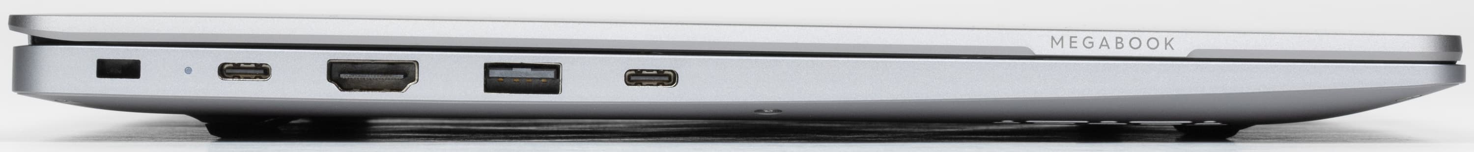 На левом боку имеются отверстие кенсингтонского замка, двухцветный светодиодный индикатор (белый+оранжевый), разъем USB Type-C для подключения адаптера питания (и только для этого — передача данных не поддерживается, это отмечено в официальных описаниях и проверено нами), полноразмерный порт HDMI, порты USB 3.1 Type-A и еще один USB Type-C, на этот раз полнофункциональный.