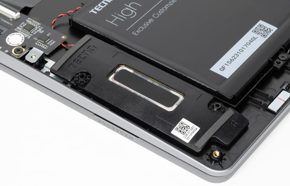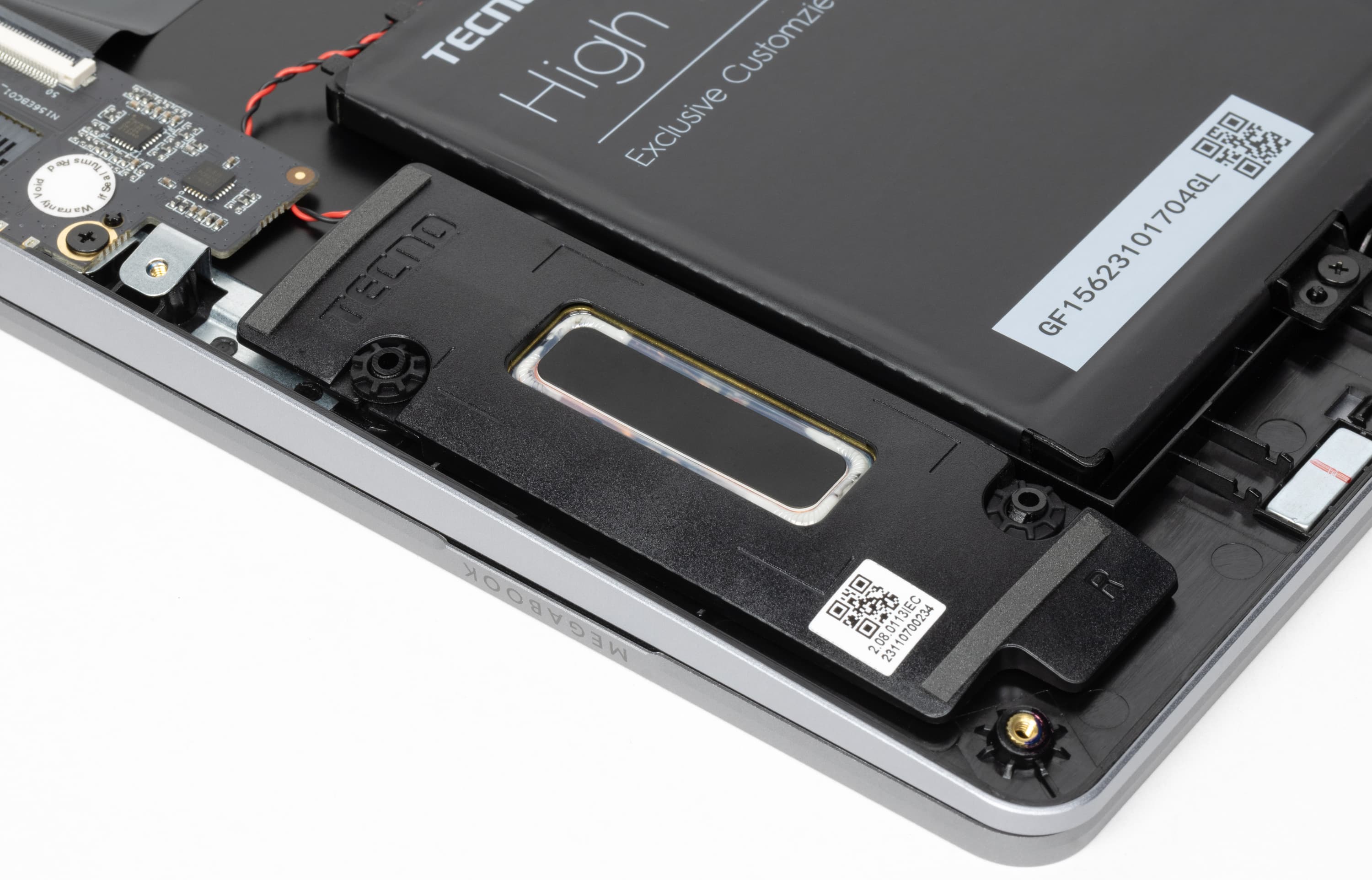 Дизайн общий для ноутбуков Tecno Megabook T: выглядят эти модели вполне элегантно, хотя впечатление несколько портится при открытой крышке из-за обилия разноцветных наклеек, которые хоть и свидетельствуют наглядно о некоторых достоинствах аппаратов, но с эстетической точки зрения выигрышным решением точно не являются.