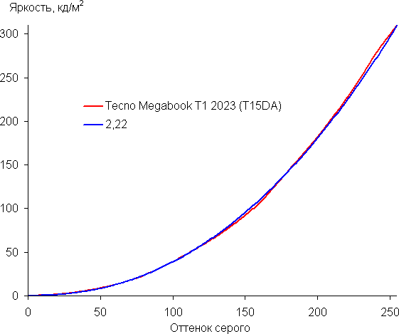 Рост прироста яркости на большей части шкалы серого более-менее равномерный, и каждый следующий оттенок ярче предыдущего. В самой темной области аппаратно и визуально различаются все оттенки: