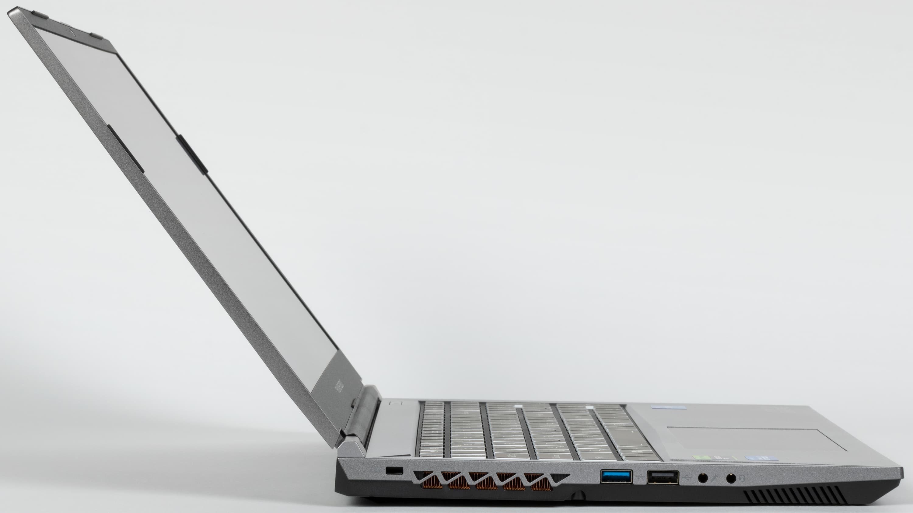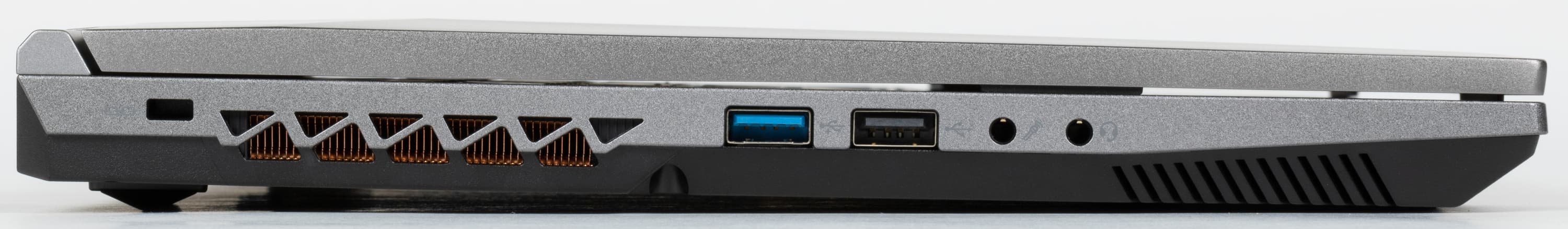 На левой боковой панели имеется отверстие кенсингтонского замка, решетка выходного отверстия системы охлаждения, порты USB 3.1 Gen1 Type-A и USB 2.0, разъемы для подключения внешнего микрофона и наушников.