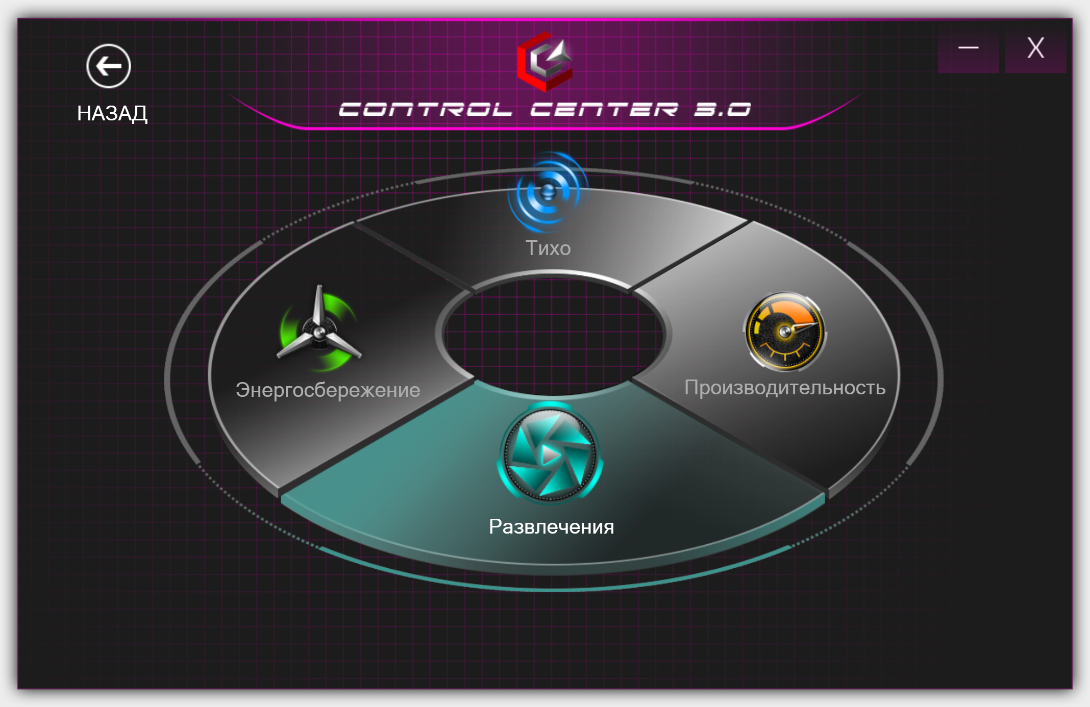 Доступны четыре сценария (пресета, профиля) мощности: «Производительность», «Развлечения», «Энергосбережение» и «Тихо». Их особенности можно определить по названиям, и мы рассмотрим их более подробно в разделе о тестировании ноутбука под максимальной нагрузкой.