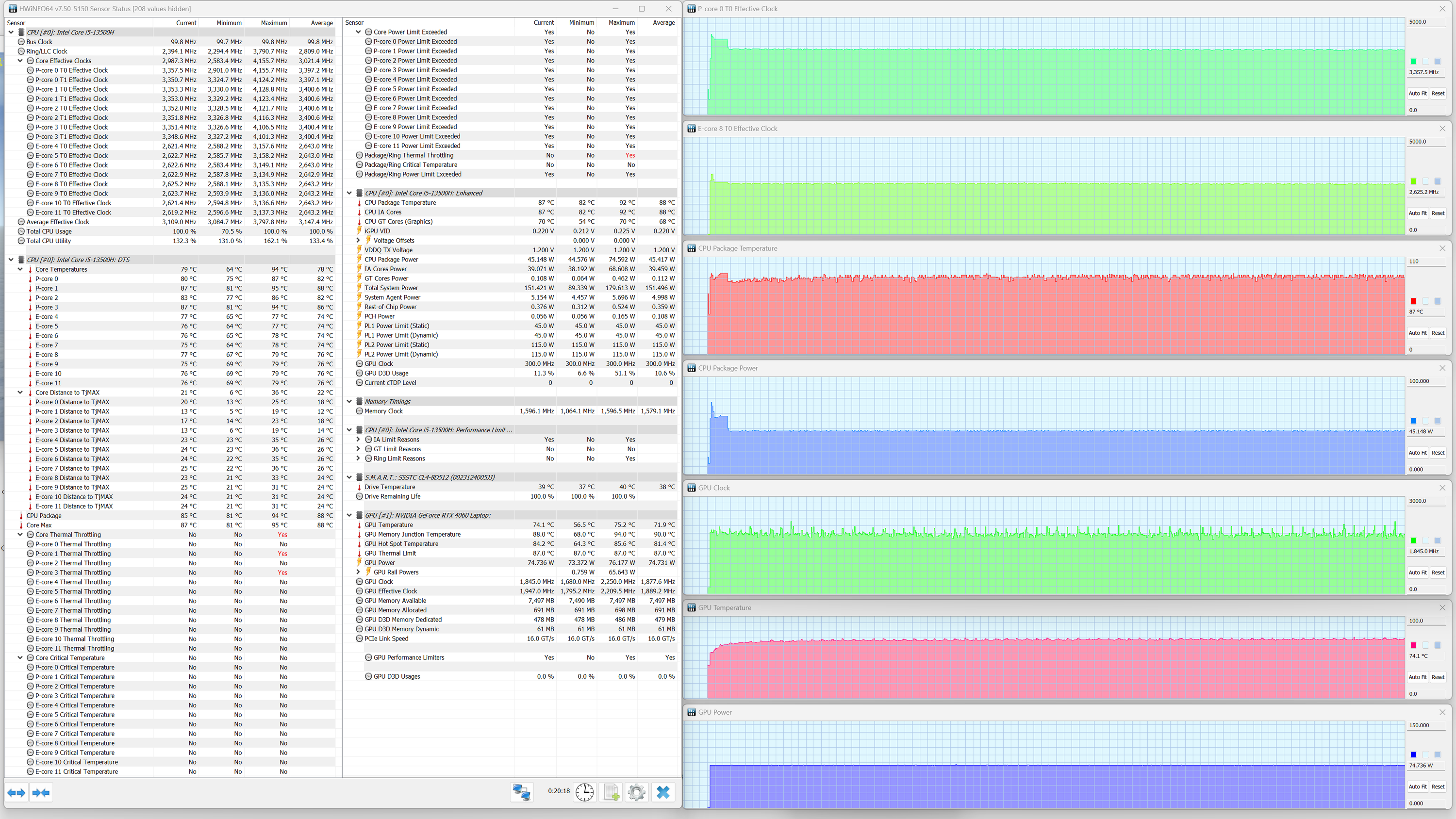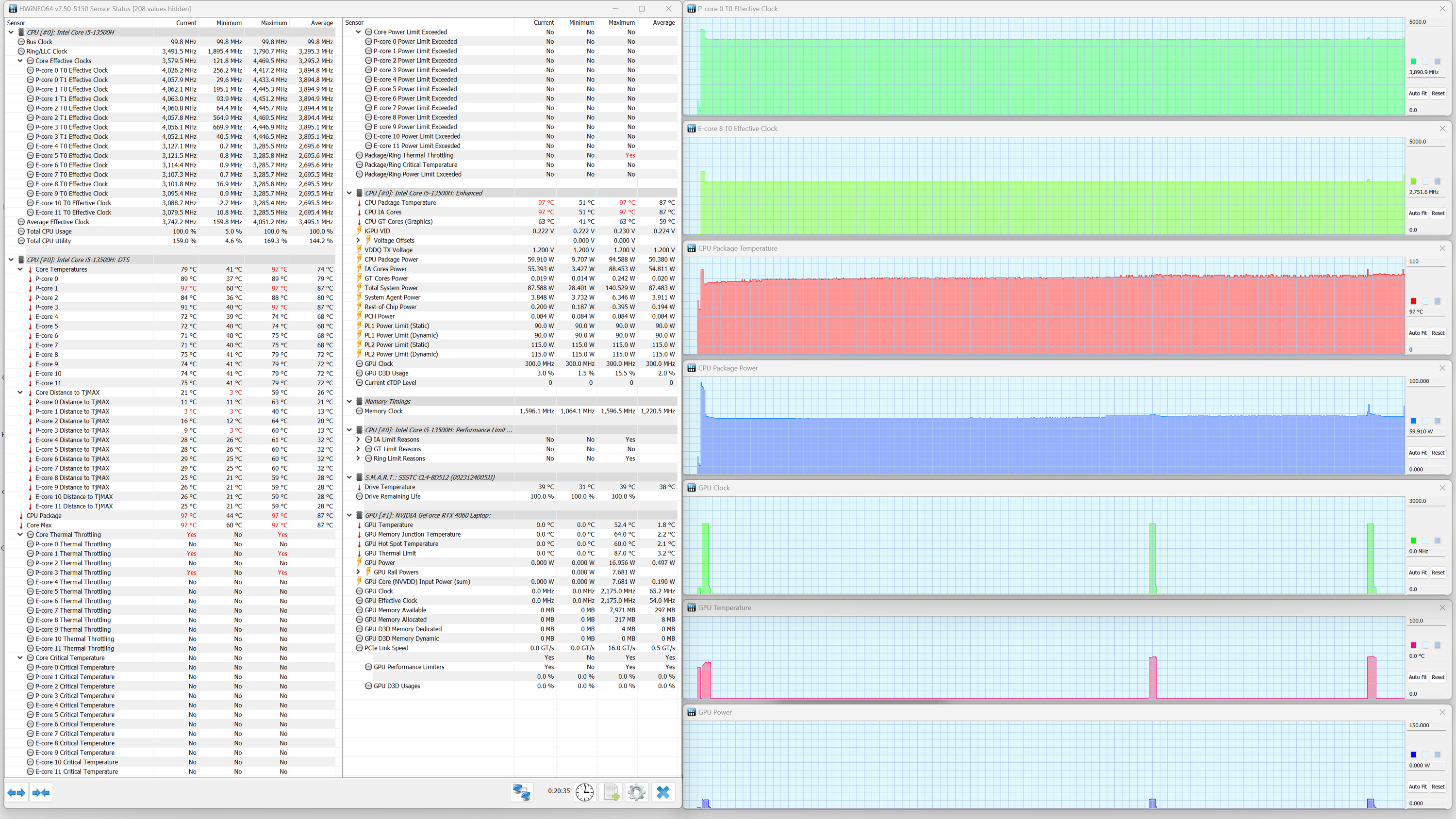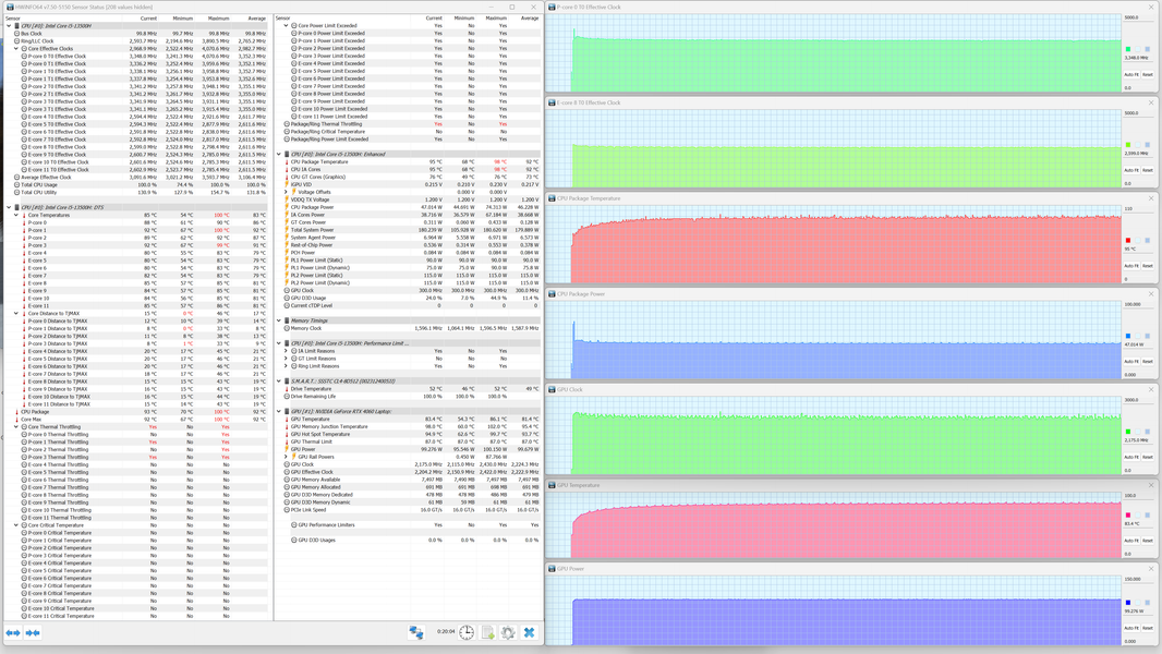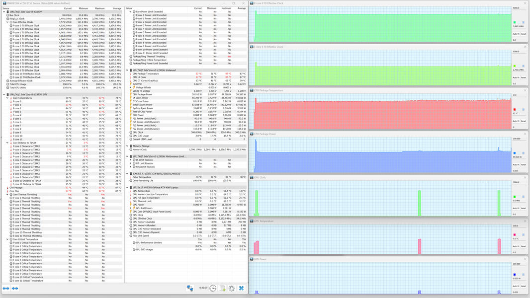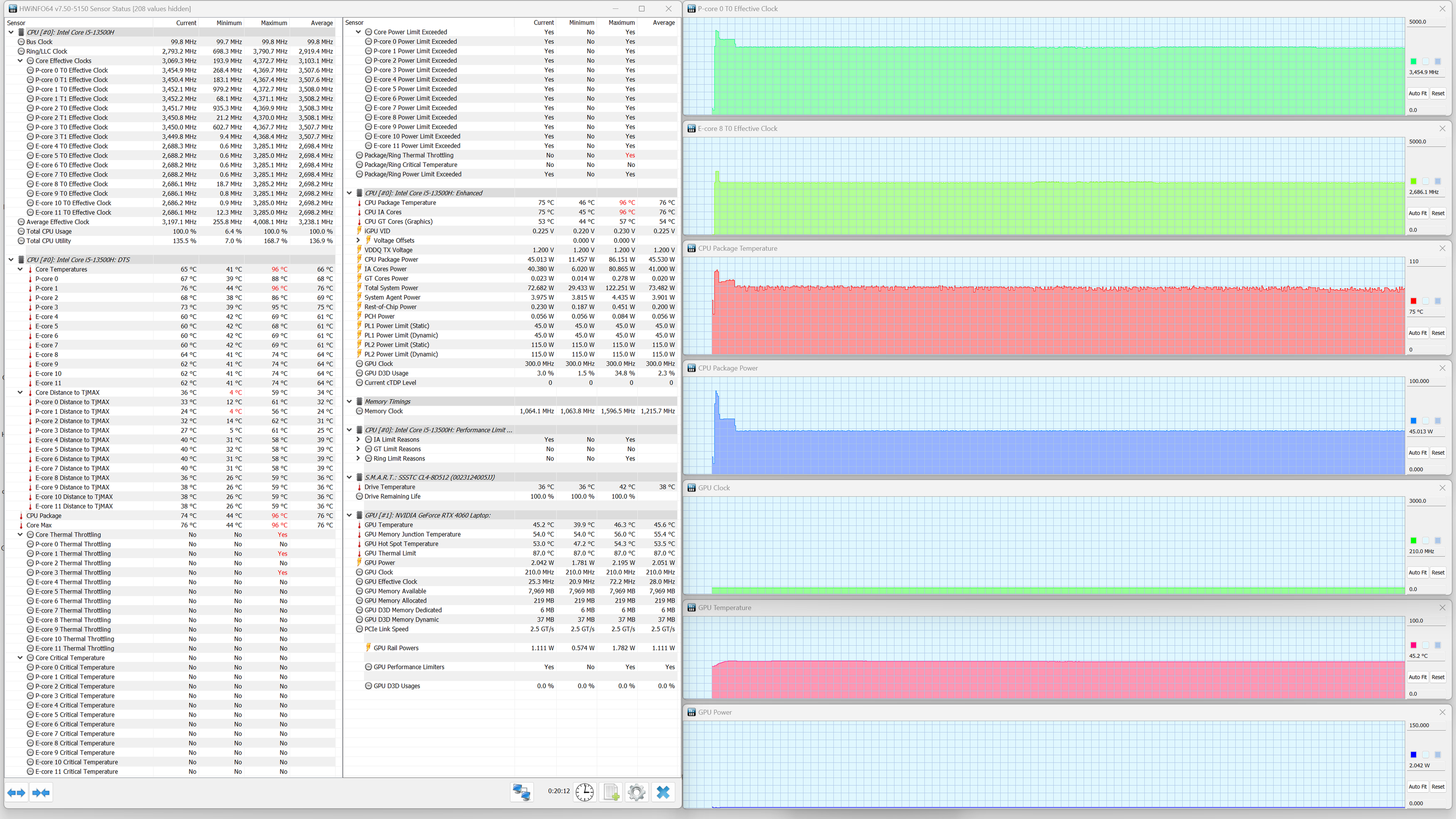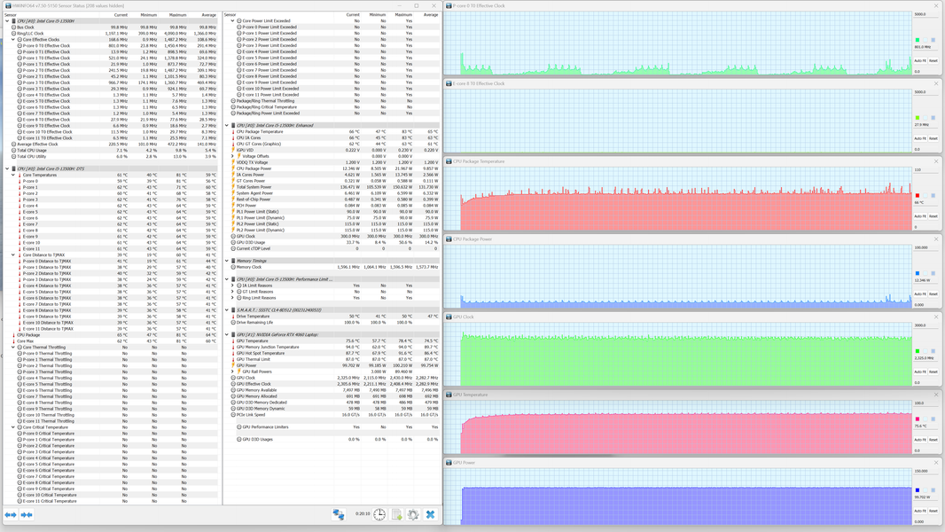 Thunderobot 911 M G3 Pro оснащен мобильным процессором Intel Core i5-13500H (кодовое наименование Raptor Lake-H) среднего уровня производительности. В его распоряжении имеются четыре высокопроизводительных, или P-ядра (Performance cores), работающих в два потока (базовая тактовая частота 2,6 ГГц, в турборежиме — до 4,7 ГГц), и восемь энергоэффективных, или E-ядер (Efficient cores), работающих в однопоточном режиме (базовая тактовая частота 1,9 ГГц, в турборежиме — до 3,5 ГГц). Отбор мощности в соответствии со спецификациями теплопакета составляет от 35 до 45 Вт в стандартном режиме и до 95 Вт при Turbo Boost. В тестировании под нагрузкой мы выявили, что в высокопроизводительных сценариях потребление CPU составляет при разгоне 95 Вт, а в стабильном режиме — 60 Вт. Таким образом предписание TDP превышено. Низкоуровневые параметры главного вычислителя доступны в приложении HWinfo.