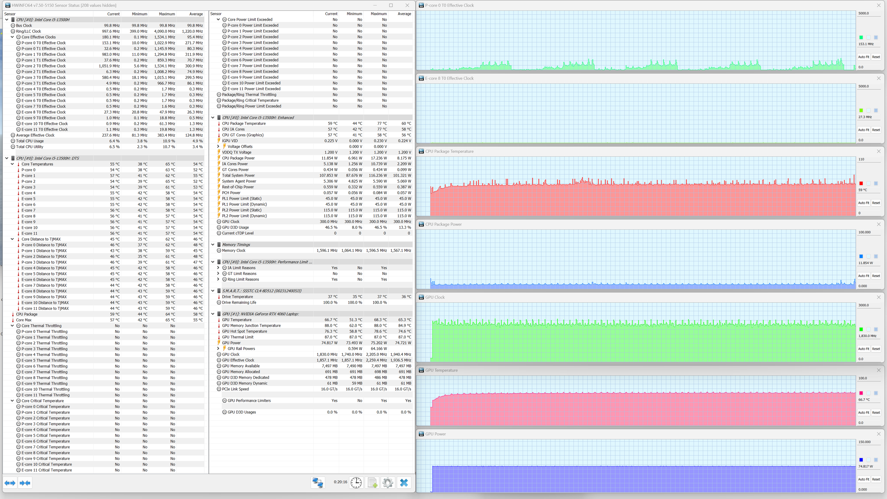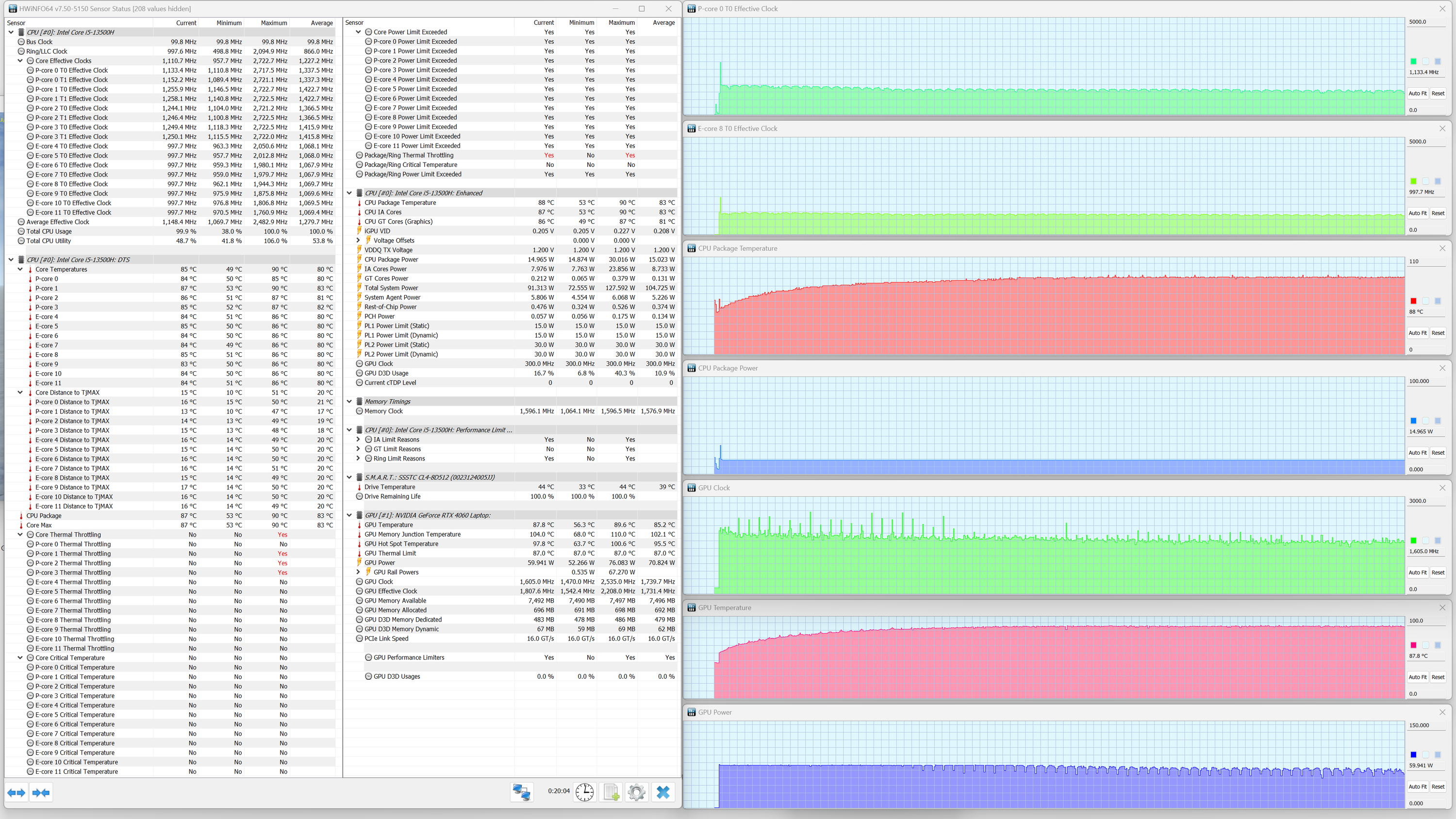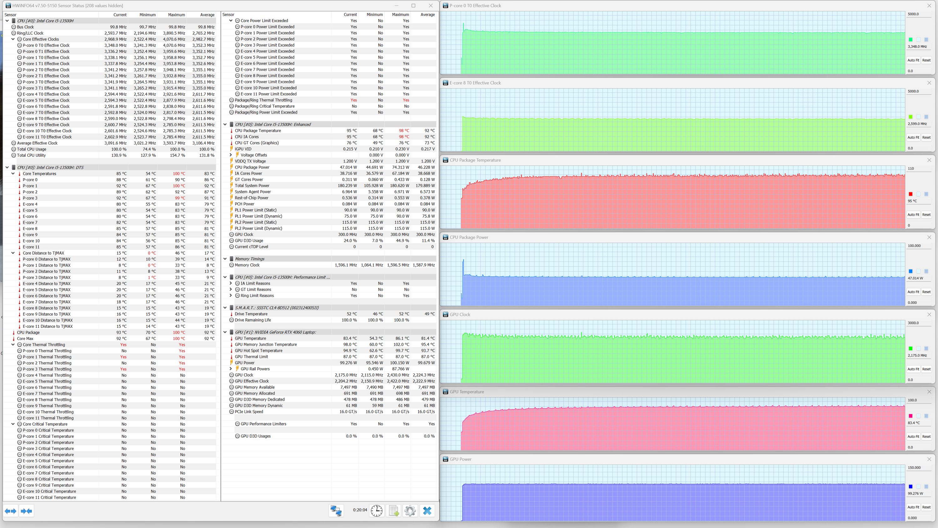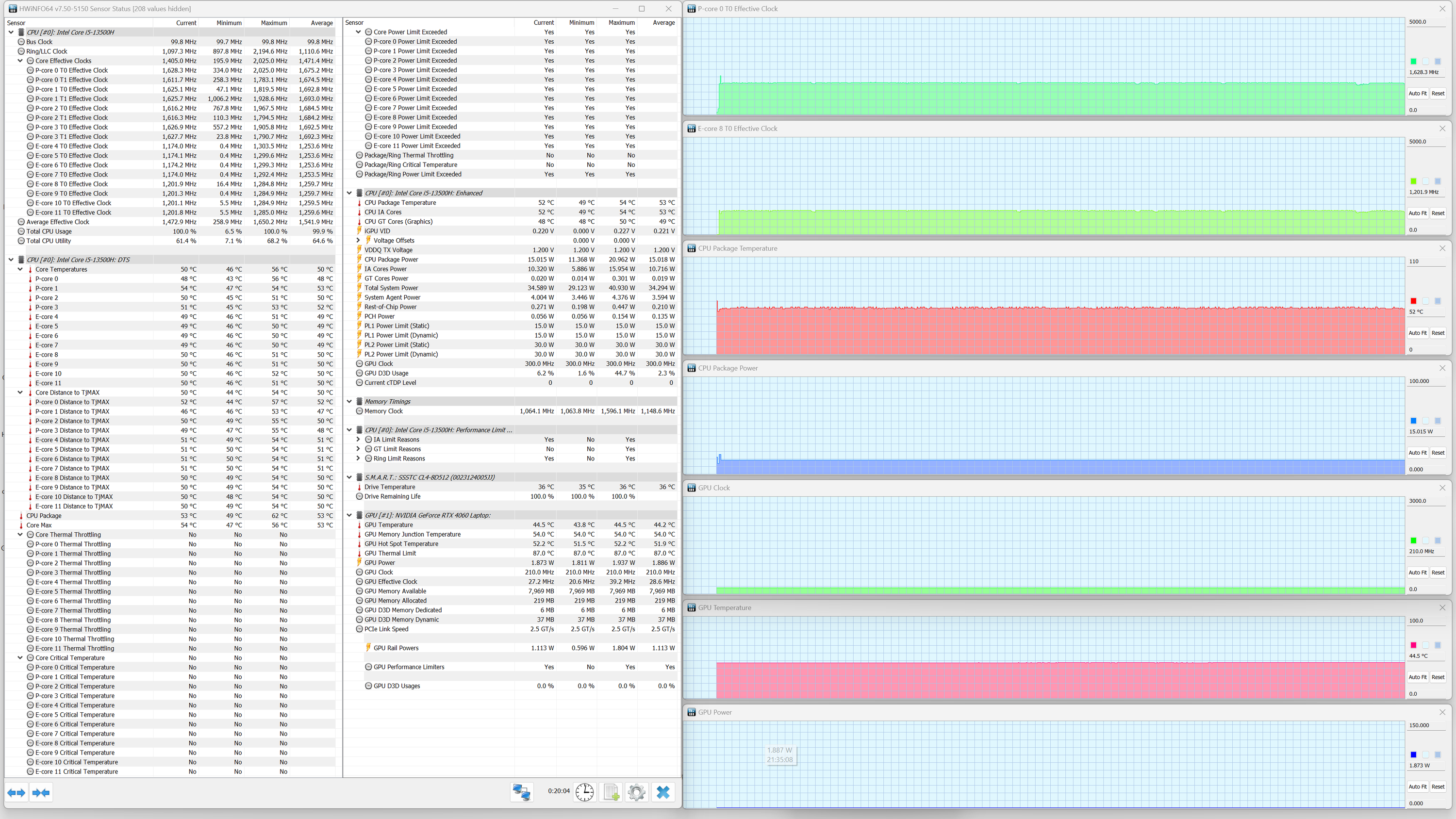 Thunderobot 911 M G3 Pro оснащен мобильным процессором Intel Core i5-13500H (кодовое наименование Raptor Lake-H) среднего уровня производительности. В его распоряжении имеются четыре высокопроизводительных, или P-ядра (Performance cores), работающих в два потока (базовая тактовая частота 2,6 ГГц, в турборежиме — до 4,7 ГГц), и восемь энергоэффективных, или E-ядер (Efficient cores), работающих в однопоточном режиме (базовая тактовая частота 1,9 ГГц, в турборежиме — до 3,5 ГГц). Отбор мощности в соответствии со спецификациями теплопакета составляет от 35 до 45 Вт в стандартном режиме и до 95 Вт при Turbo Boost. В тестировании под нагрузкой мы выявили, что в высокопроизводительных сценариях потребление CPU составляет при разгоне 95 Вт, а в стабильном режиме — 60 Вт. Таким образом предписание TDP превышено. Низкоуровневые параметры главного вычислителя доступны в приложении HWinfo.