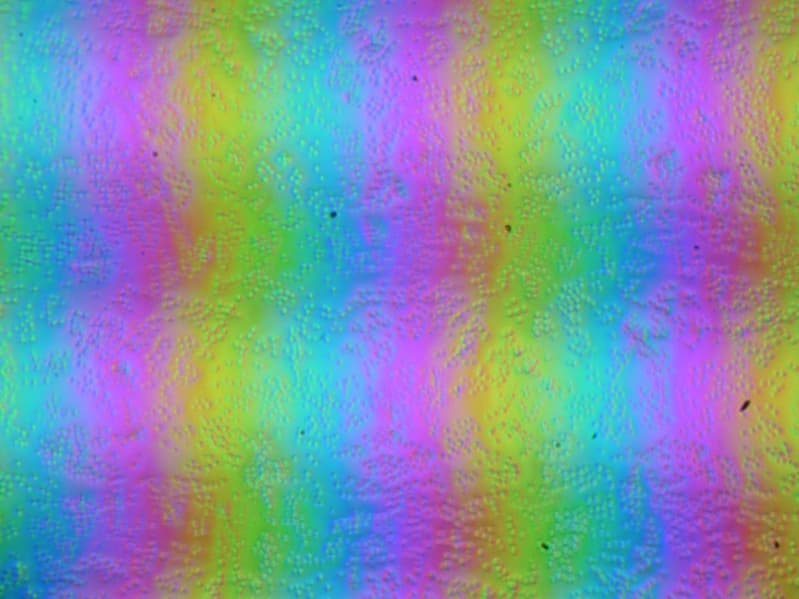 Зерно этих дефектов в несколько раз меньше размеров субпикселей (масштаб этих двух фотографий примерно одинаковый), поэтому фокусировка на микродефектах и «перескок» фокуса по субпикселям при изменении угла зрения выражены слабо, из-за этого нет и «кристаллического» эффекта.