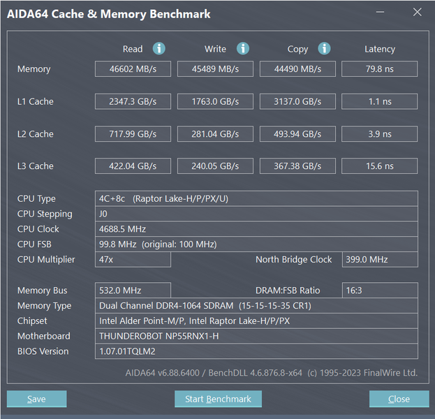 Оба модуля Samsung M471A1K43EB1-CWE по 8 ГБ равноценны по своим характеристикам, поэтому память работает в двухканальном режиме. Вот как выглядят ее показатели по итогам тестирования встроенным бенчмарком утилиты AIDA64.