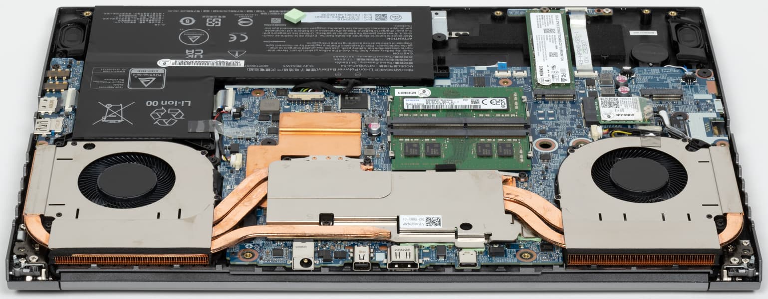 Сняв нижнюю крышку, получаем доступ к компонентам аппаратной оснастки Thunderobot 911 M G3 Pro. Здесь по величине над прочими доминируют материнская плата, система охлаждения, аккумулятор и модули оперативной памяти.