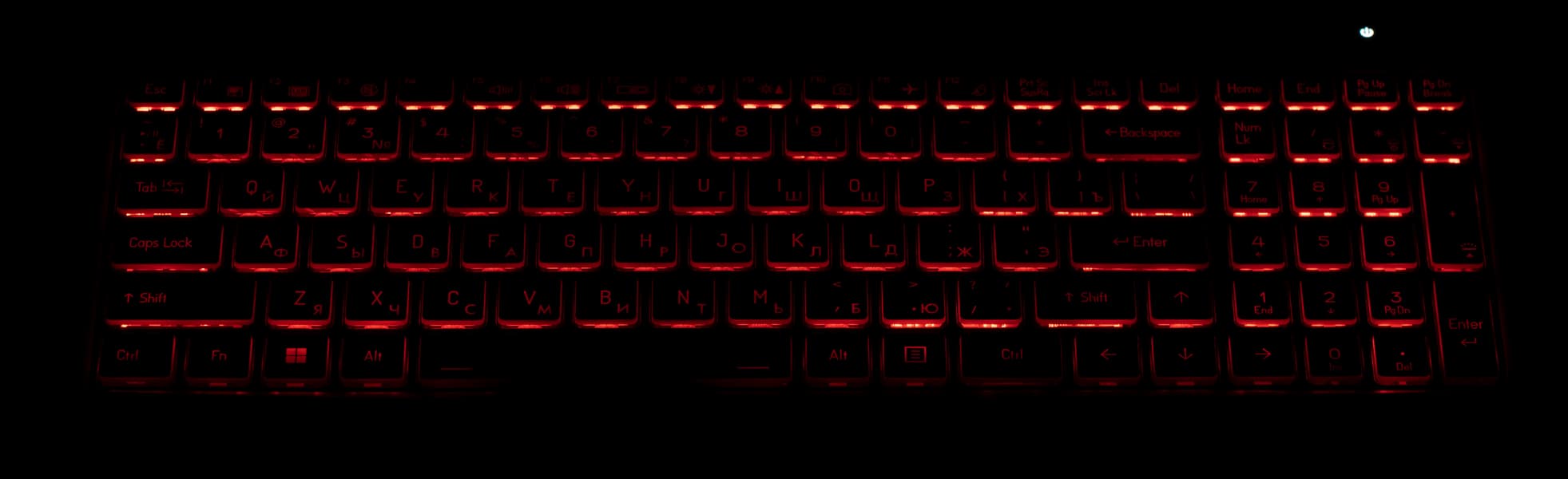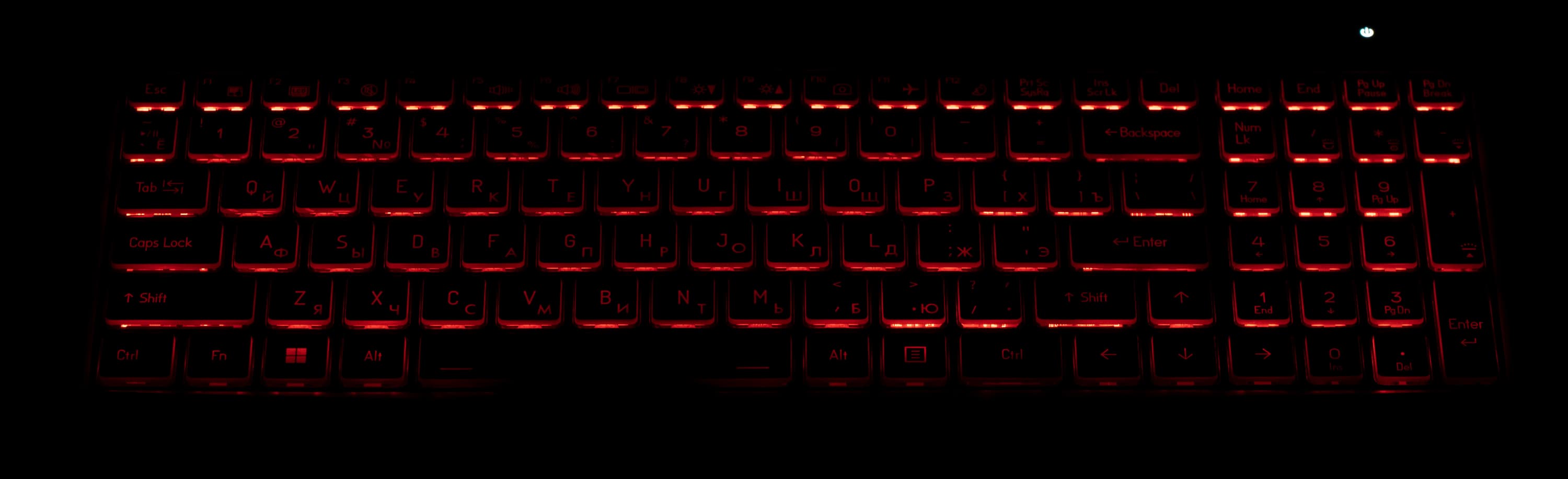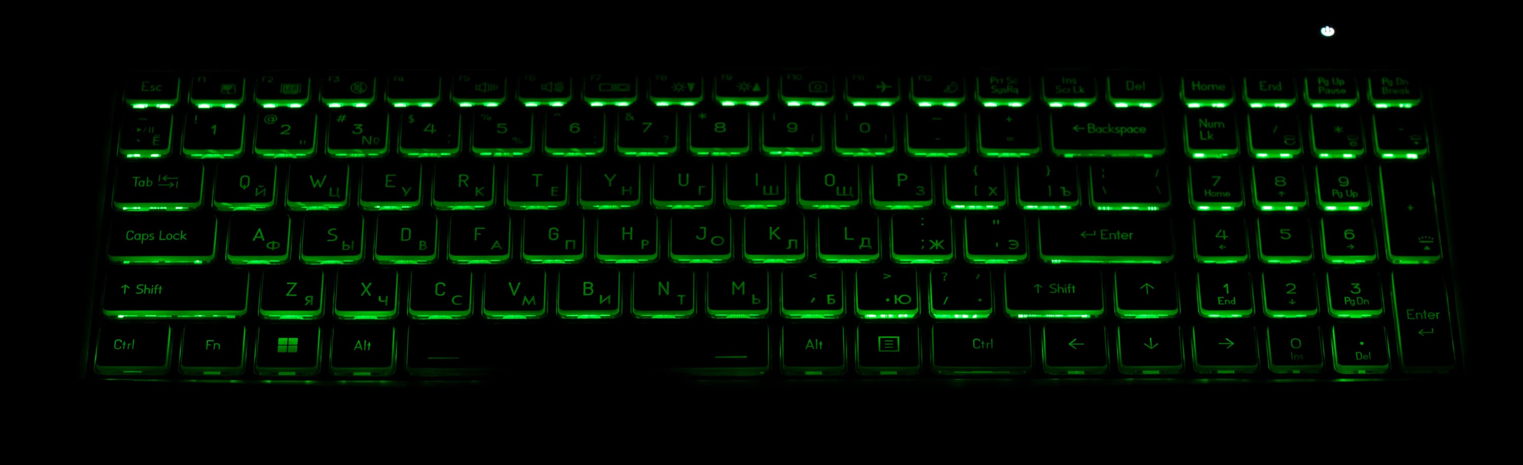 Подсвечиваются сами символы на клавишах и существенно сильнее — их контуры. Зона подсветки под каждой клавишей видна назойливо, что несколько раздражает. Распределение света и специфика маркировки национальной клавиатуры ухудшают различимость символов кириллицы.