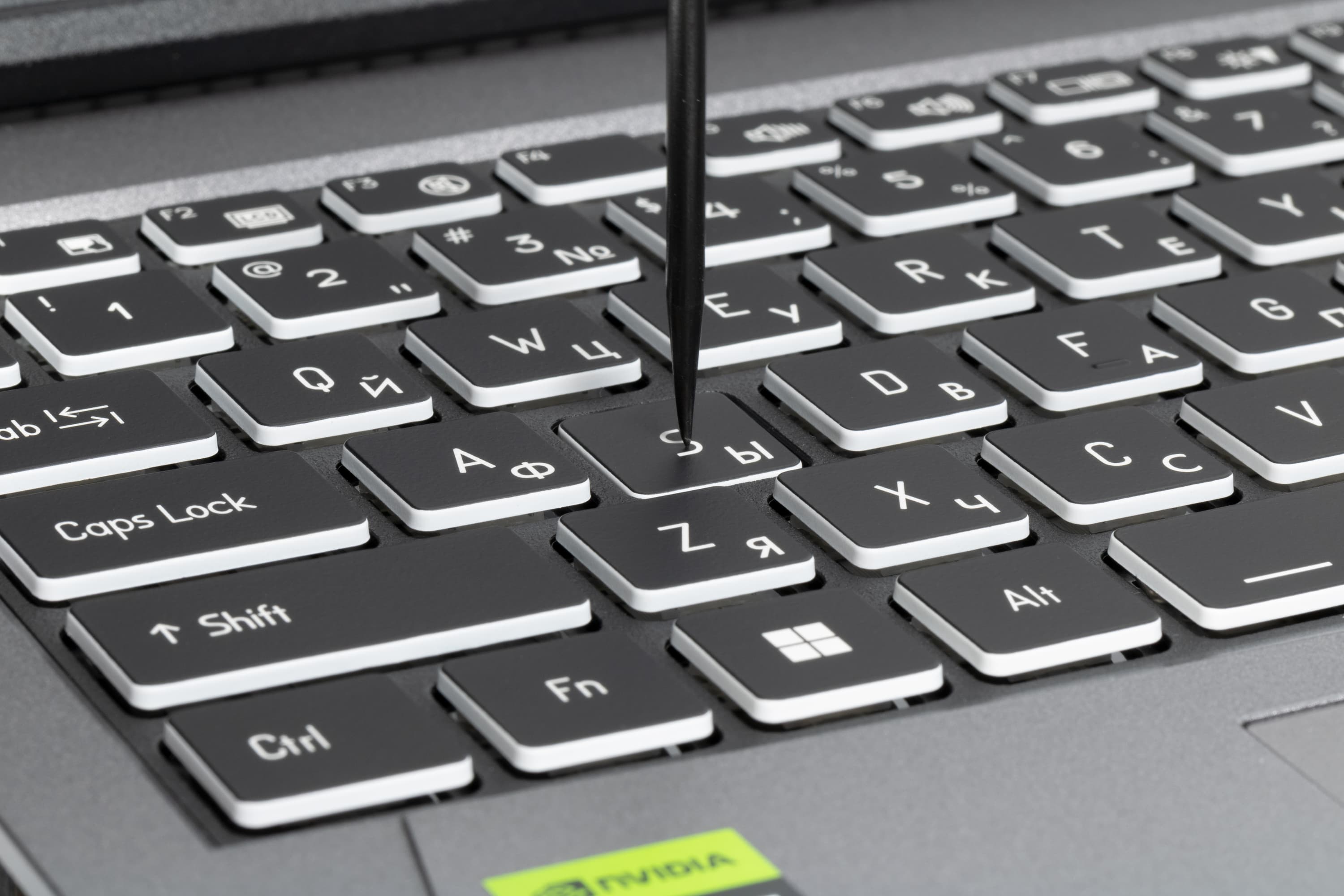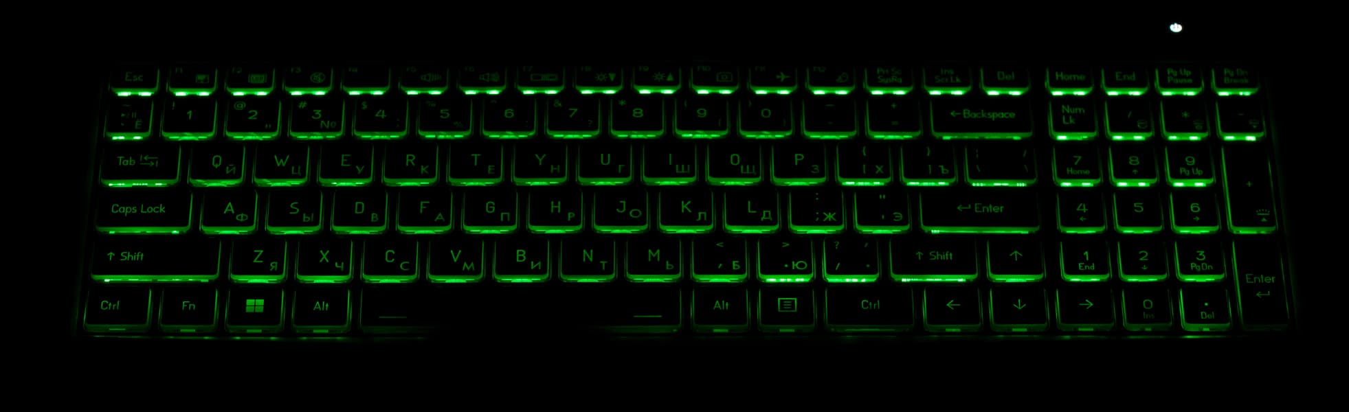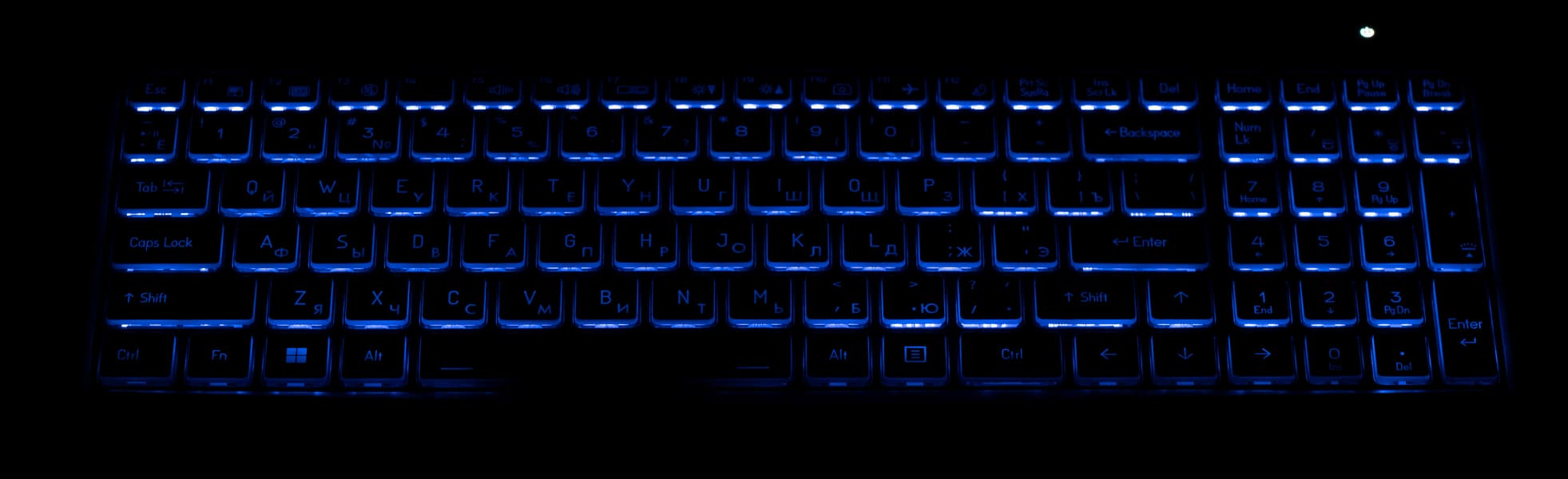 Подсвечиваются сами символы на клавишах и существенно сильнее — их контуры. Зона подсветки под каждой клавишей видна назойливо, что несколько раздражает. Распределение света и специфика маркировки национальной клавиатуры ухудшают различимость символов кириллицы.