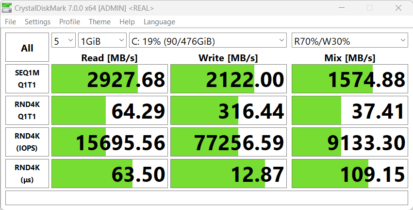 В роли системного хранилища программ и данных выступает твердотельный NVMe-накопитель SSSTC CL4-8D512 с интерфейсом подключения PCIe 4.0 ×4. Он производится в континентальном Китае на заводах Solid State Storage Technology, ныне принадлежащей японской корпорации Kioxia. Неформатированная емкость составляет 512 ГБ, а после развертывания Windows 11 и стандартного набора приложений в распоряжении пользователя остается менее 440 ГБ. Посмотрим, что по поводу этого накопителя может сообщить популярная утилита CrystalDiskMark.