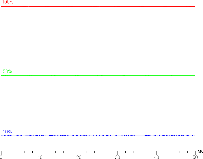 На любом уровне яркости значимая модуляция подсветки отсутствует, поэтому нет и никакого мерцания экрана (нет ШИМ). В доказательство приведем графики зависимости яркости (вертикальная ось) от времени (горизонтальная ось) при различных значениях настройки яркости: